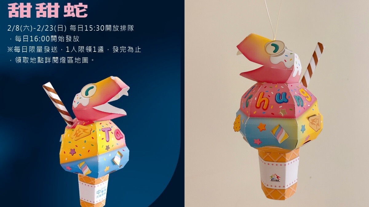 跟主燈一樣有人氣的小提燈「甜甜蛇」怎麼能錯過?以粉色霜淇淋為造型發想,上面裝飾著五顏六色配料,可手拿或手提讓賞燈時刻更具童心趣味。而在燈光點亮時,宛如手上握著一隻霜淇淋蛇,為夜幕低垂之際增添一絲幸福氛圍。每天15:30開放排隊,16:00開始發放,1人限領1盞,位置為「海洋奇幻冒險」燈區附近(詳閱燈區地圖)。