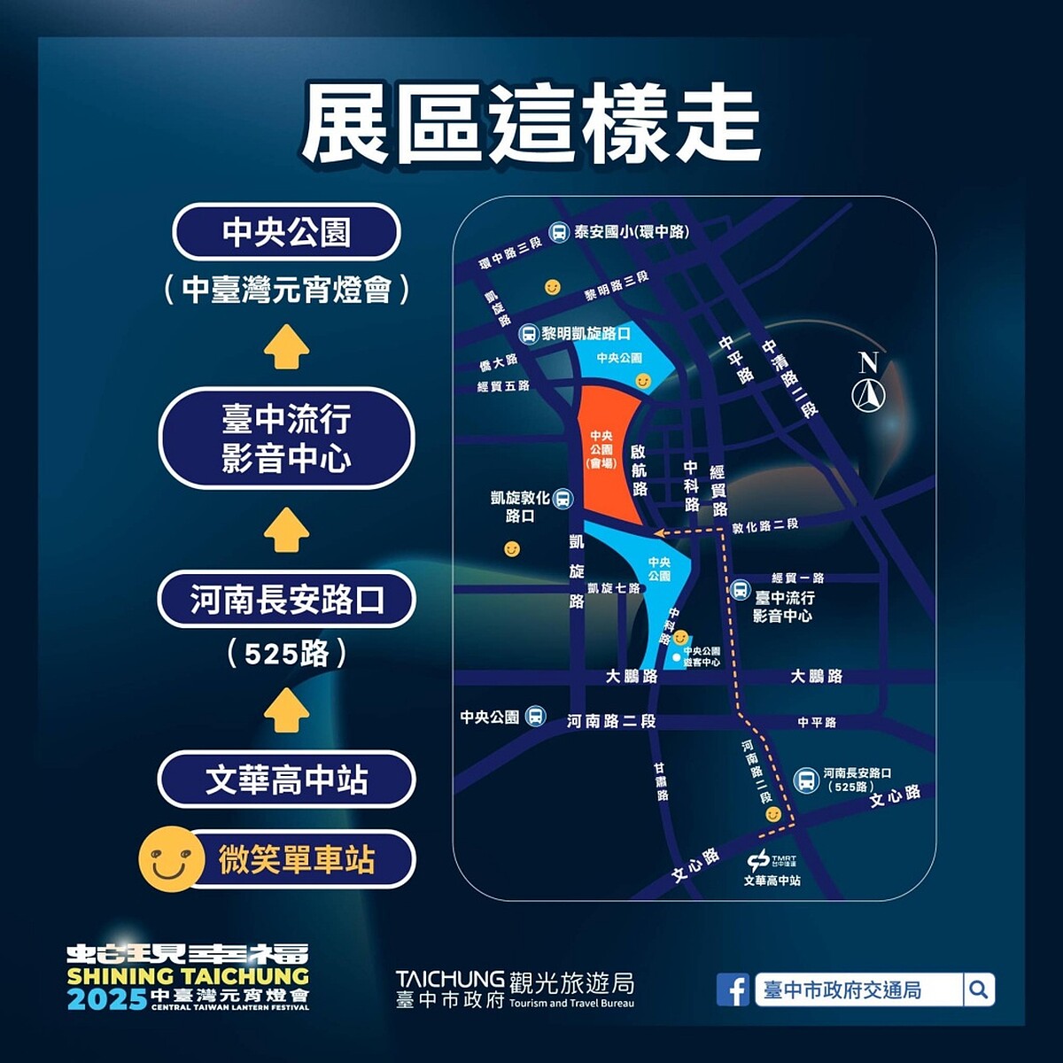 2025中台灣元宵燈會一共規劃9大燈區,有上述的「蛇現幸福」主燈、以詩意述說台中山海屯故事的「城市綠洲」燈區、加入台中特色美食的「舌尖上的趣味」燈區、號召各國跟蛇有關的神祉齊聚的「群蛇共舞」燈區、腦洞大開的「蛇麼玩意」燈區、蘊含時空及傳說等神秘色彩的「時空狂想曲」燈區、展現海洋與生物多樣性之美的「海洋奇幻冒險」燈區、以「金蛇尋寶」故事為靈感的「蛇畫故事」燈區、結合樂成宮月老及廟宇意象的「樂In Love」燈區,每半小時上演一場月老燈光秀、AI互動燈組,一整天都逛不完!