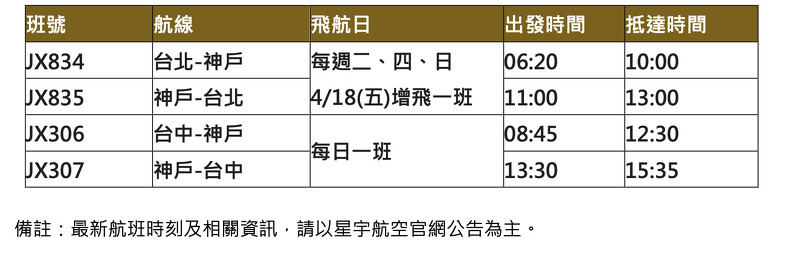 JX306航線:台中 (RMQ)—神戶 (UKB)