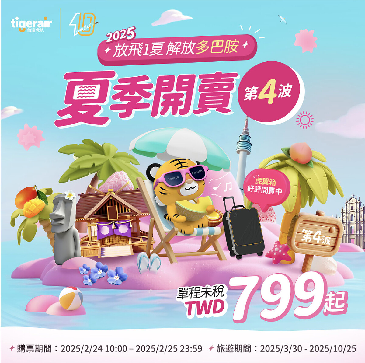 台灣虎航在2025年迎來創立10週年大日子,繼先前多次祭出限時機票優惠後,現在再次驚喜線上第四波!錯過前幾次的人,快把握時間購入便宜機票,北中南三地都能出發!