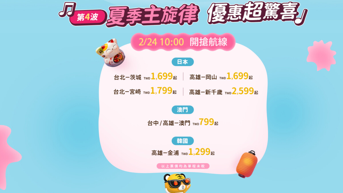 台灣虎航|2025 夏季航班第四波優惠