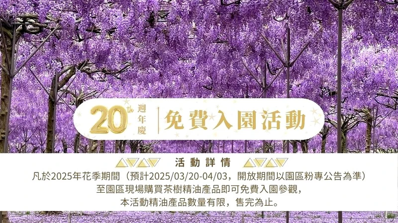 2025年是「淡水紫藤花園」成立20週年的大日子,園區公開會與人氣動漫《鬼滅之刃》合作,園區內會看到10位角色登場,讓遊客更能感受如動漫中的絕美畫面。在花季期間入園、與角色拍照打卡會額外贈送電影限定明信片。另外開放期間只要在現場購買園區種植及蒸餾的茶樹精油,即可免費入園,拍完美照後還能延續美好氣氛,實在太療癒啦!
