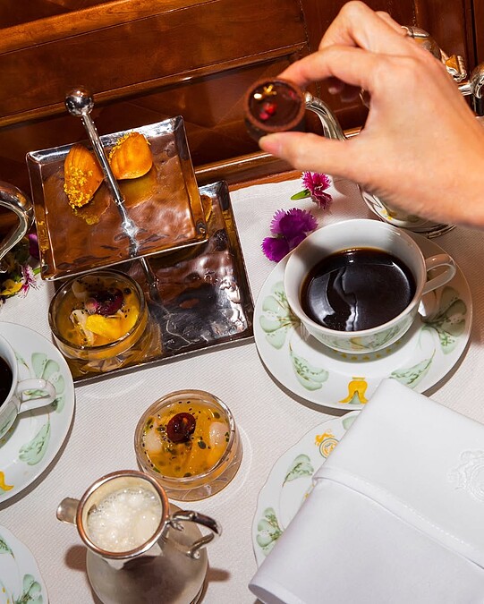 當時,他與 Pourcel 兄弟(Jacques et Laurent Pourcel)在列車上舉辦餐會,卻因為全程都在廚房工作而無法拍照留念。「我覺得整個體驗太迷幻了。它不僅僅是一輛移動的餐廳或廚房,更像是一部電影,隨著火車行駛,場景不斷變化,每一道菜的呈現都與窗外的風景交織出獨特的故事。」那次難忘的經歷讓在他心中種下了一個夢想:「希望有朝一日,能夠親自策劃這列傳奇列車的餐飲體驗。」因此2020年,當「Belmond」邀請合作他毫不猶豫地答應接手,抓住了21年前許下的心願。