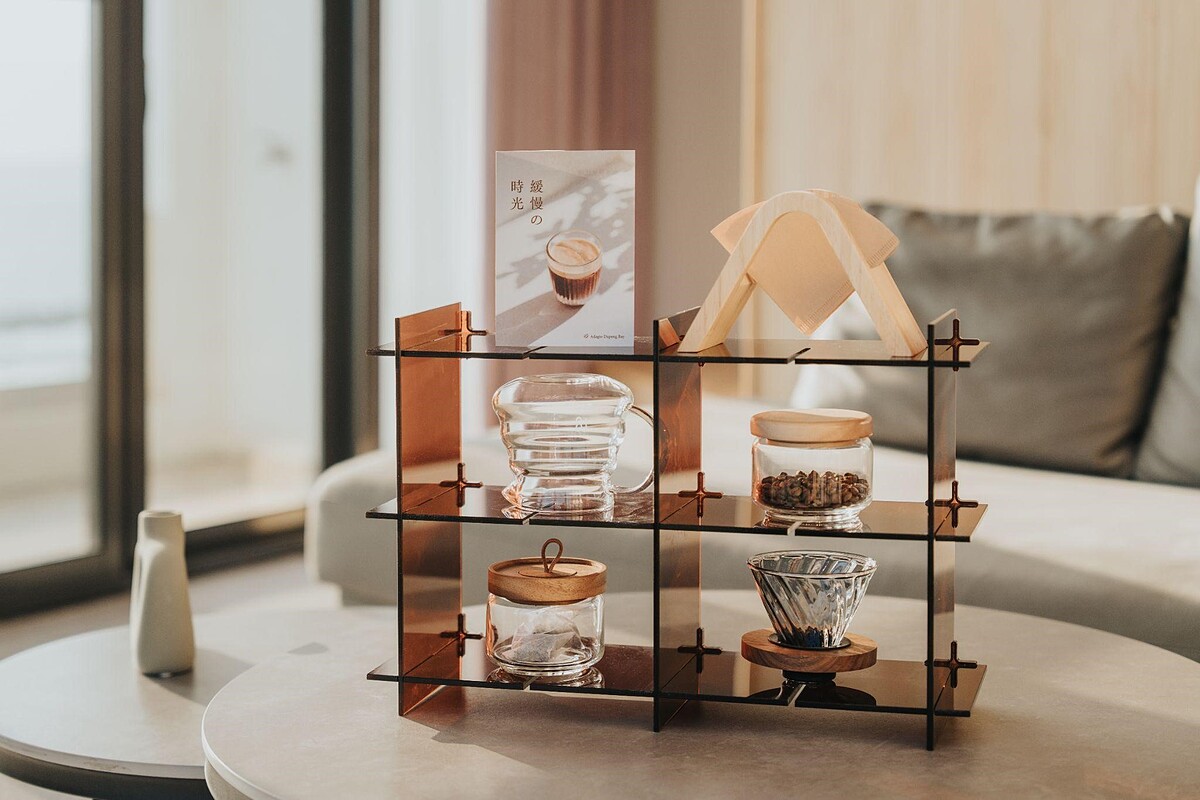 當清晨的光灑進房內,旅人可以不用匆忙,慢慢地起身。每間客房都備有手沖道具及來自東港的青年品牌「33 1/3 咖啡焙煎所」的咖啡豆。親手沖一杯熱咖啡,看著香氣隨水氣升起,伴隨著咖啡香,享受與自己對話的早晨慵懶時光。