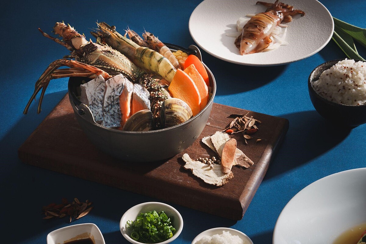 日落後的餐桌上,端出的是選用在地漁獲與食材的「島島漁夫鍋」:寶石鱸魚、草蝦,還有當地阿嬤親手製作的烏魚子。管家上菜時,總不忘說上一句:「這是你們今天經過的魚塭裡養的喔!」這句話像是為這一鍋賦予了更多情感與背景,讓味道不只來自食材,更來自地方的真誠與溫度。沒有浮誇擺盤,不過度調味,保留了食材的純粹,也保留了大鵬灣的真實。