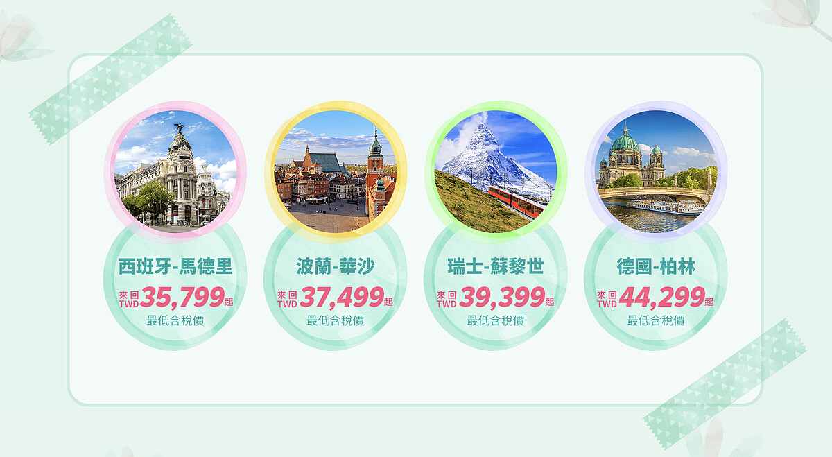 另外針對跟團旅客,長榮航空也有多項商品選擇,「魅力歐洲」首推法國比利時荷蘭10日106900元起、瑞士法國10日132900元起、西班牙11天107900元起、西班牙葡葡牙14天164900元起。美洲部分的「玩美加族」商品有西雅圖溫哥華洛磯山脈,12日行程有夏季限定的加拿大賞鯨船、走訪洛磯山脈四大國家公園、保證入住城堡飯店、哥倫比亞冰原雪車體驗,價格為142900元起。