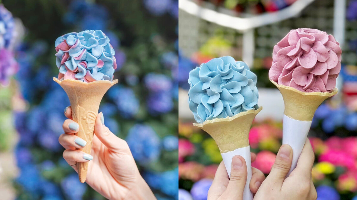 在視覺淨化同時,別忘了味蕾也能享受繡球花之美!Roses Bar推出擁有夢幻造型的「繡球花造型花淇淋」花季也能吃得到,一支200元,有玫瑰、優格及綜合口味(玫瑰+優格),馬卡龍粉紅及粉藍色調美到捨不得吃呀。