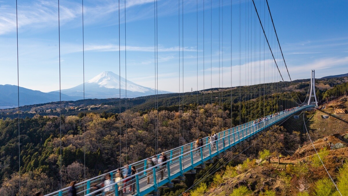 位於靜岡縣的三島天空步道,距離地面70公尺,全長400公尺,是日本目前最長的步行專用吊橋。天氣好的話,走在刺激的步道能遠眺富士山與駿河灣,周圍連綿不絕的伊豆山脈全景也一併盡收眼底。喜歡森林冒險活動的各位,也可以在北區參加高空滑索、越野車、攀岩等活動,貓頭鷹動物館則適合大小朋友一起互動。