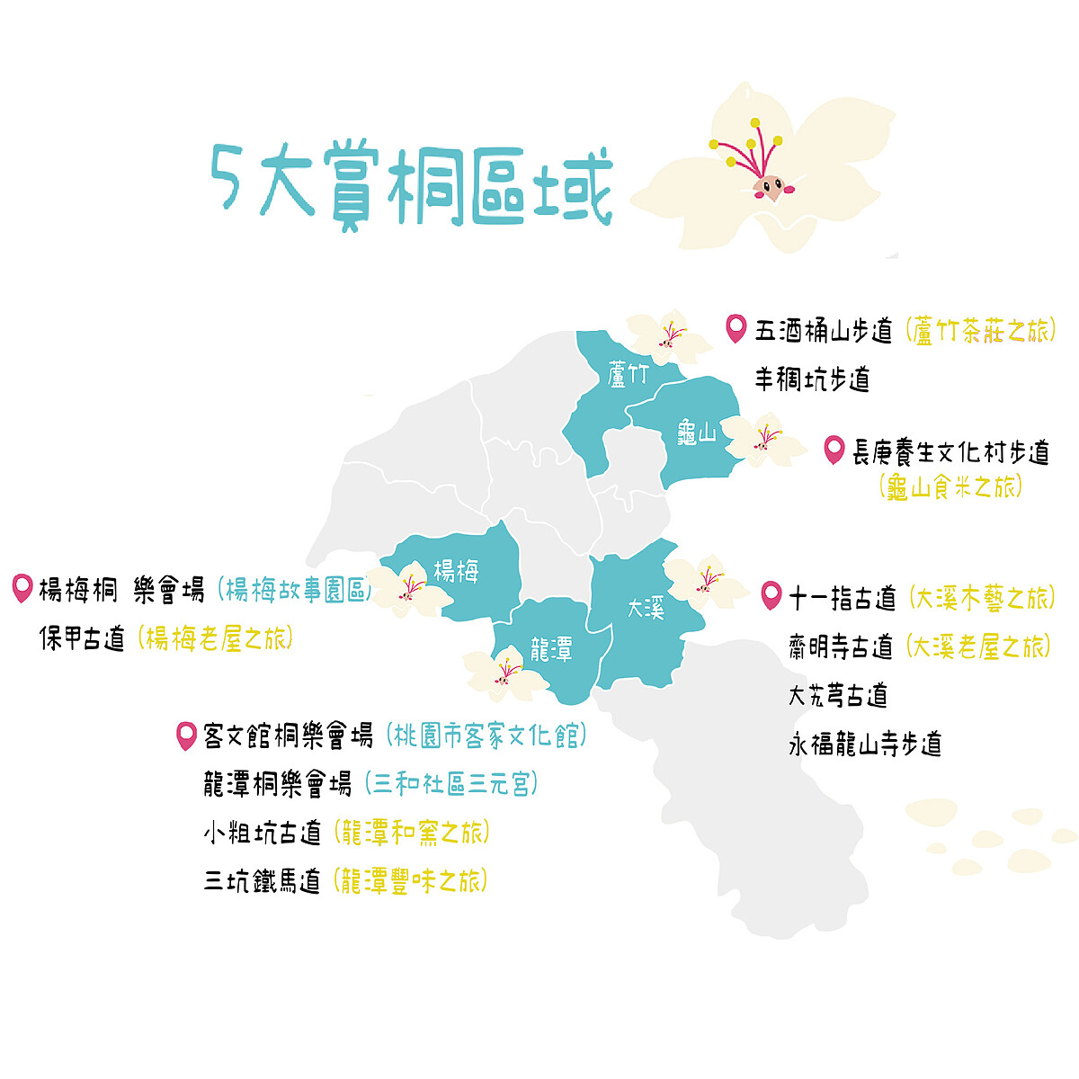 期望各位遊客都能盡情欣賞「五月雪」的點點浪漫,官方特別製作「油桐花秘境地圖」,公開大溪、龍潭、蘆竹、楊梅、龜山等5大賞桐區域、共有10處賞花秘境,讓人能親身感受一年一度的絕美畫面,快收藏起來週末或放假時立刻出發。