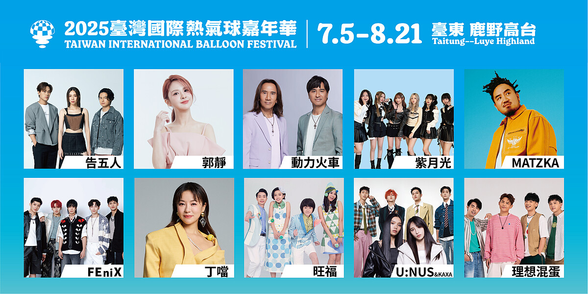 2025備受矚目的熱氣球嘉年華,活動規劃十分周全,根據活動時程總共安排了共八場的光雕音樂會,從開幕的告五人,到壓軸的理想混蛋,中間還穿插了動力火車、郭靜、丁噹、Matzka…等音樂人,透過從鹿野高台到池上的大坡池、太麻里曙光園區與台東國際地標,音樂、光影與土地之間,使飄散在空氣光影中的音樂符碼與參加的群眾進行彼此映照的美好流動。