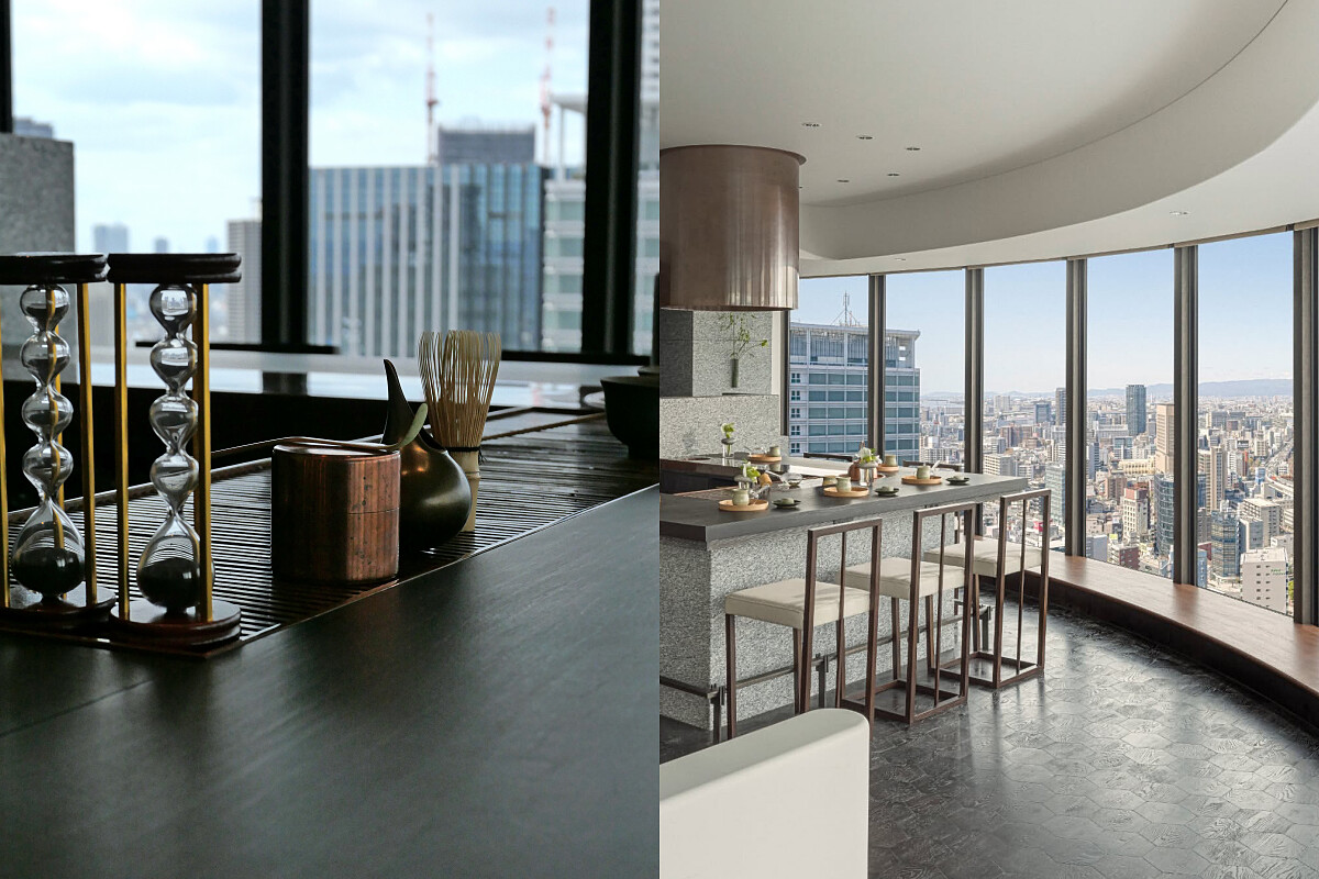 而在同一層樓,還能遇見重量級名廚的身影。「Sushi L'Abysse Osaka」是米其林三星主廚 Yannick Alléno 與日籍壽司職人聯手打造的高空壽司吧,讓人不必飛往巴黎,也能在大阪品味到他對「時間、發酵與職人精神」的詮釋。空間由法國舞台設計師 Laurence Bonnel-Alléno 操刀,空間融合現代藝術與日式美學,營造出寧靜且富有詩意的用餐氛圍。