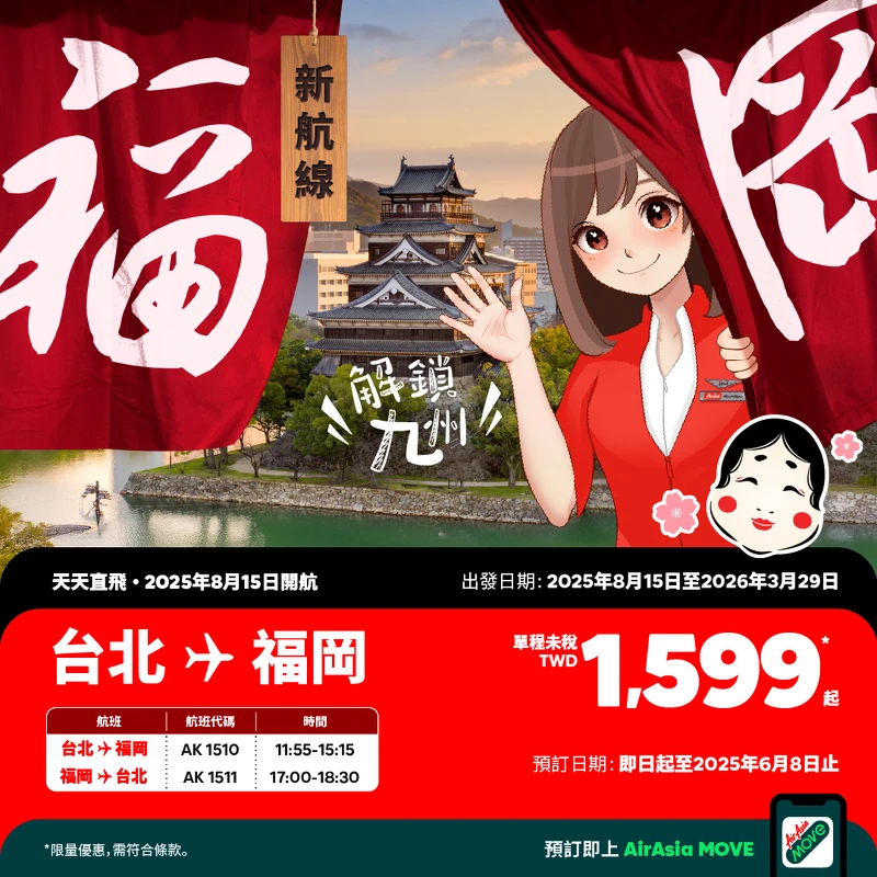 「台北-福岡」成為AirAsia台灣第13條直飛航線、台灣出發的第5條日本航線,單程優惠未稅價1599元,即日起至6/8開放預訂此促銷票價,搭乘期間為2025/8/15~2026/3/29。