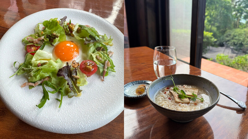 翌日晨間,早餐也以多道菜色徐徐展開。新竹德龍商店的水潤餅佐以蘭陽平原的手工豆腐乳、翠綠的太陽蛋沙拉點綴馬告清香,還有鹹香豆腐、暖心粥品,與光中杏製成的溫潤杏仁茶。最後,以一杯花果香氣奔放的手沖咖啡,在迷人的綠意中,開啟從容的早晨時光。
