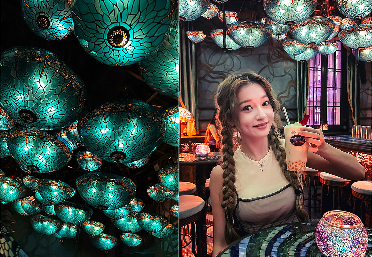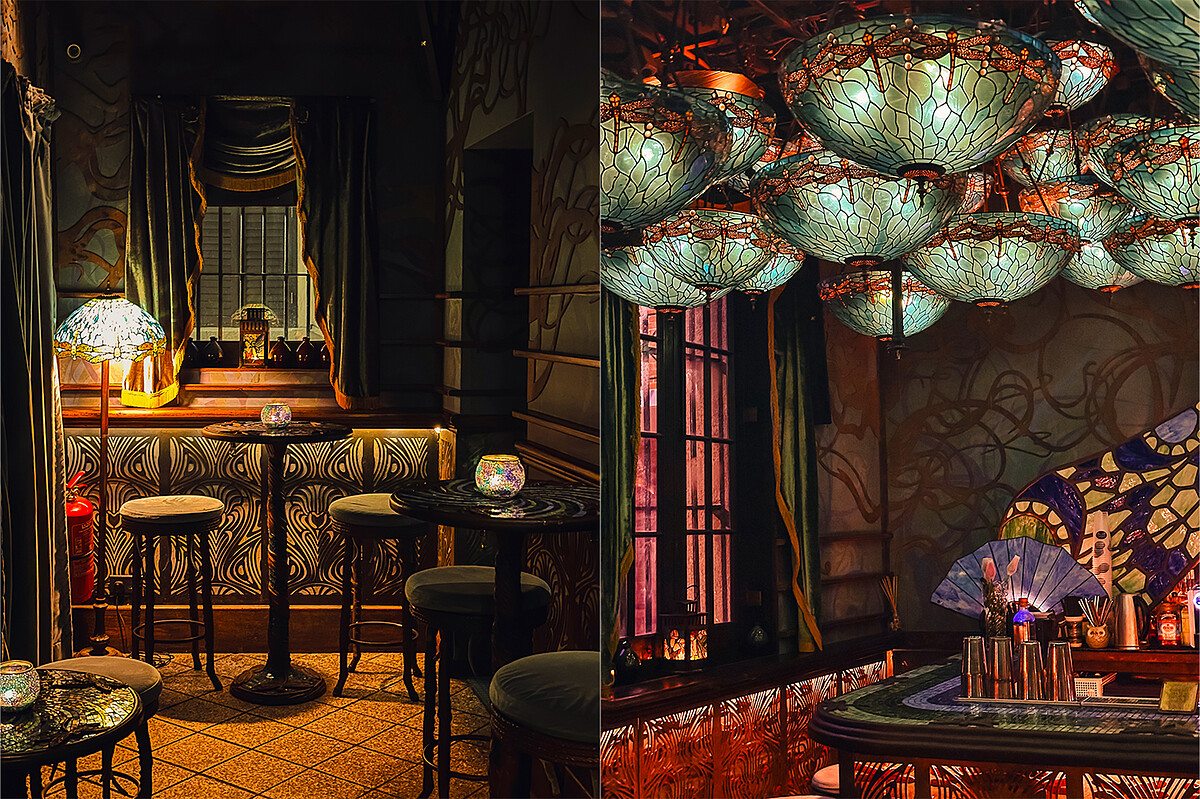 隱身在中環最受矚目的文創園區大館中,小巧精緻的Dragonfly酒吧有著充滿異國情調的絢麗玻璃藝術燈飾,藍綠相間融入金色線條與異國圖騰的空間視覺,讓人彷彿走入迷幻宇宙的幻境中,以幽暗燈光與燭光相互匯聚的神秘氣氛,加上一杯杯精心打造出獨特口感、在味蕾上釋放多樣果香與酒釀層次的調酒,對於酒吧有著精緻質感品味高標準的時尚女生們而言,完全擁有讓人想朝聖打卡的極大吸引力,而對於想安靜和朋友小酌談心的I人來說,更是探訪香港夜生活酒吧清單中的首選之一!