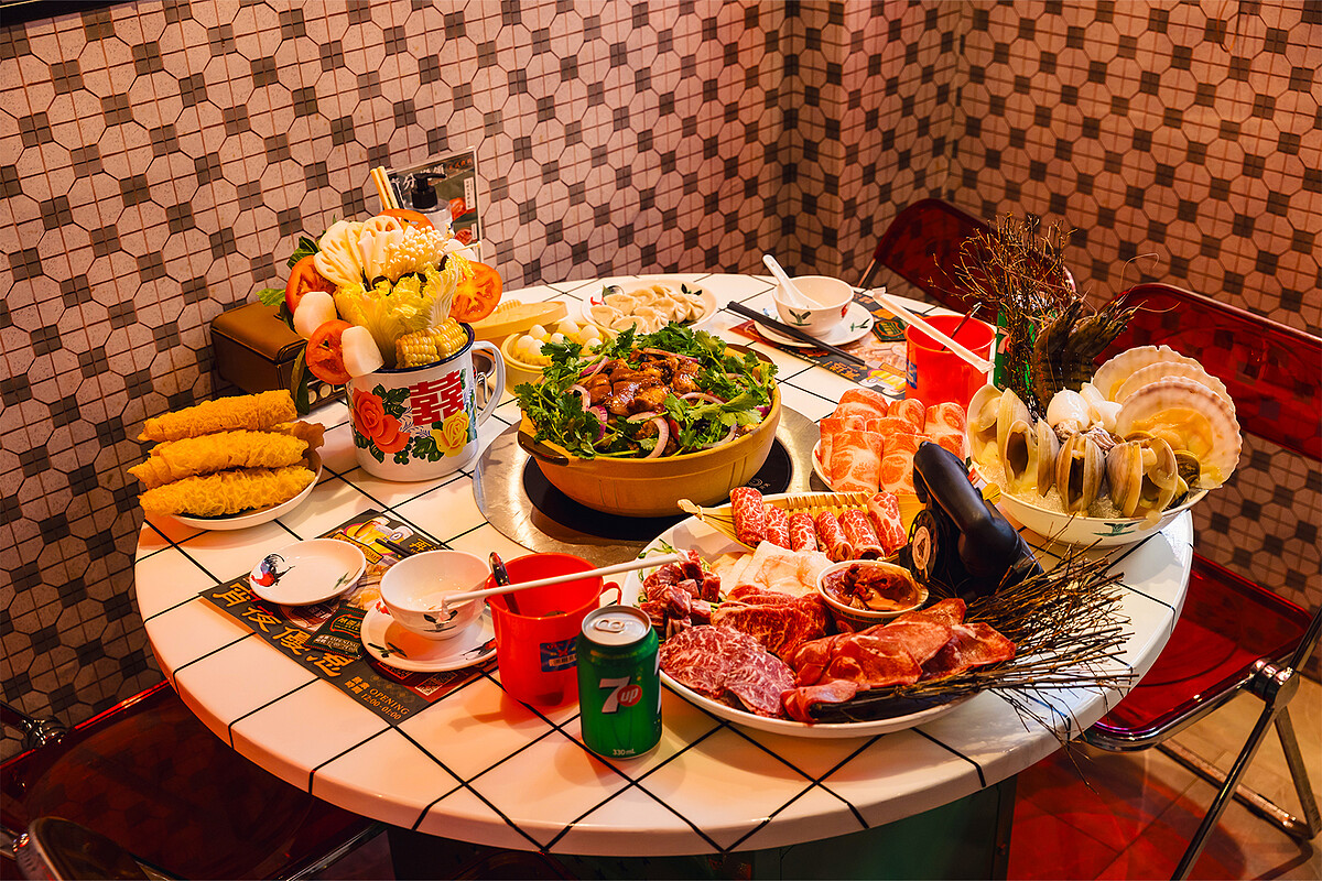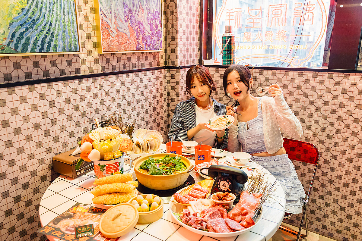 濃郁香醇的雞煲湯頭,搭配各種新鮮肉品、海產、蔬菜一起燉煮,鍋底的雞肉還細心鑲嵌進清脆爽口的蔬菜丁,光是看到多樣當季時蔬裝入港味濃厚的復古花杯,呈現出有如花束的繽紛姿態就令人感到其用心,再點上道地的凍檸七、凍梅七、凍檸茶,伴隨著80、90年代的香港金曲迴盪在耳邊,令人彷如置身的香港電影中主角聚會的場合,時髦又有特色、熱鬧接地氣,即使用餐結束也依舊回味無窮。