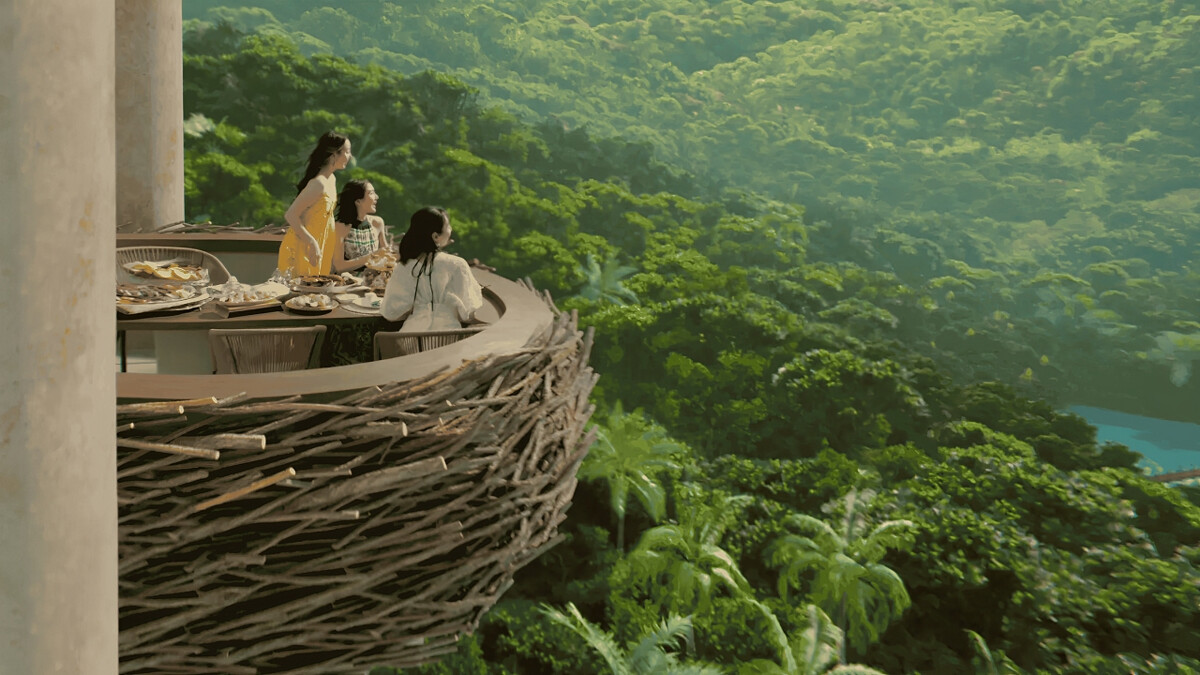 餐廳首推鳥巢形露天坐位區,入席該區映入眼簾的是美到令人屏息的壯麗叢林和一望無際的藍天景色。位於入口村落的 PANORAMA DINING,因地理位置優勢可將樂園的奢華景色盡收眼底,室內運用大片高至天花板的落地窗,打造出開闊舒適的用餐空間。餐點採用大量沖繩當地食材,透過主廚創新手法展現出截然不同的魅力。黃昏的漸變色彩、南國夜空中綻放的煙火、隨著時間變化的景致,體驗與大自然共鳴的官能饗宴。
