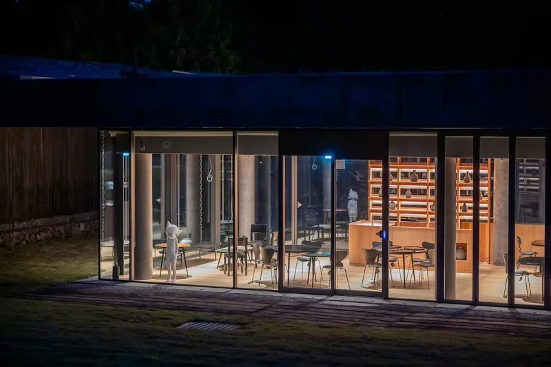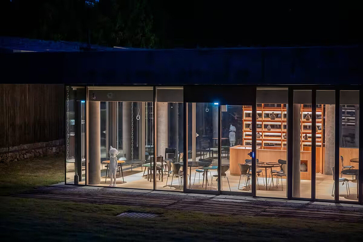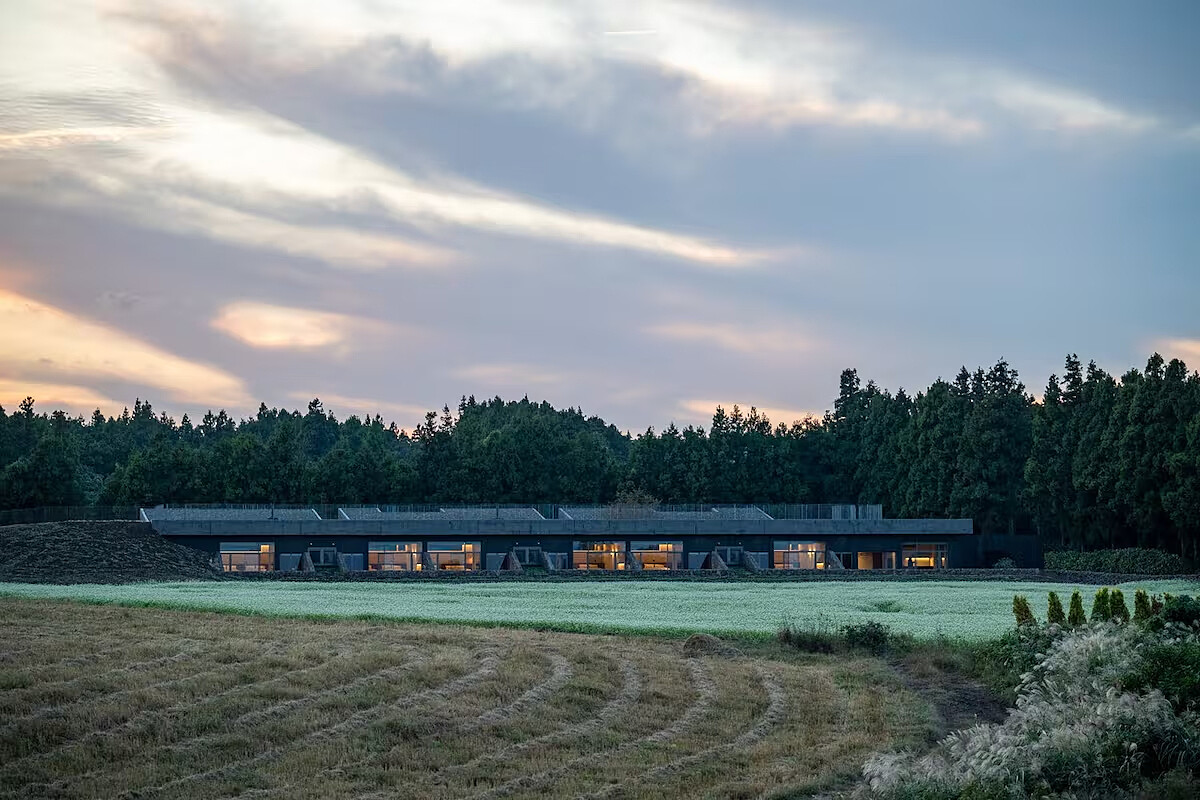 擔任設計的公司Z-Lab透露,「Nureut」在濟州島方言中意為「下坡路」,初衷是分享初次遇到這個地方時的舒適感。建築採用簡約的設計元素,最大限度地減少對景觀的影響,並自然地依偎在傾斜的地形上。除了與自然無縫融合的水平佈局外,建造「Nureut」的材料也深深植根於濟州島的歷史和文化。建築的下部採用當地出土的天然石材,致敬這片土地,而裝飾材料則參考了農場周圍樹木的紋理。屋頂採用裸露的黑色混凝土,隨著時間的推移,混凝土會自然風化,令人聯想到濟州島火山岩。客房大致分為四種類型:土屋、蘆葦屋、雪松屋和石屋,,每種都以農業和濟州島的隱喻為主題,營造出一種向大自然敞開的氛圍。