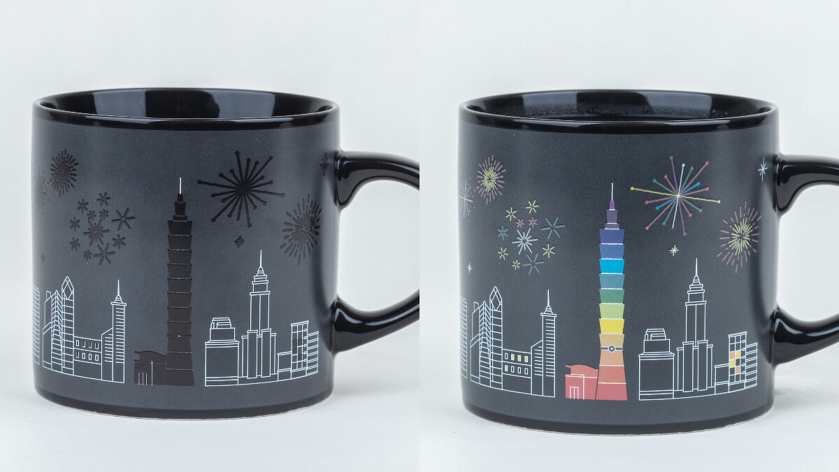只要在杯中倒入熱水,杯身上的圖案就會染上色彩,呈現出夜晚煙火和彩虹大樓的景象,超驚喜的巧思讓這款變色馬克杯成為旅人最愛的紀念品之一。