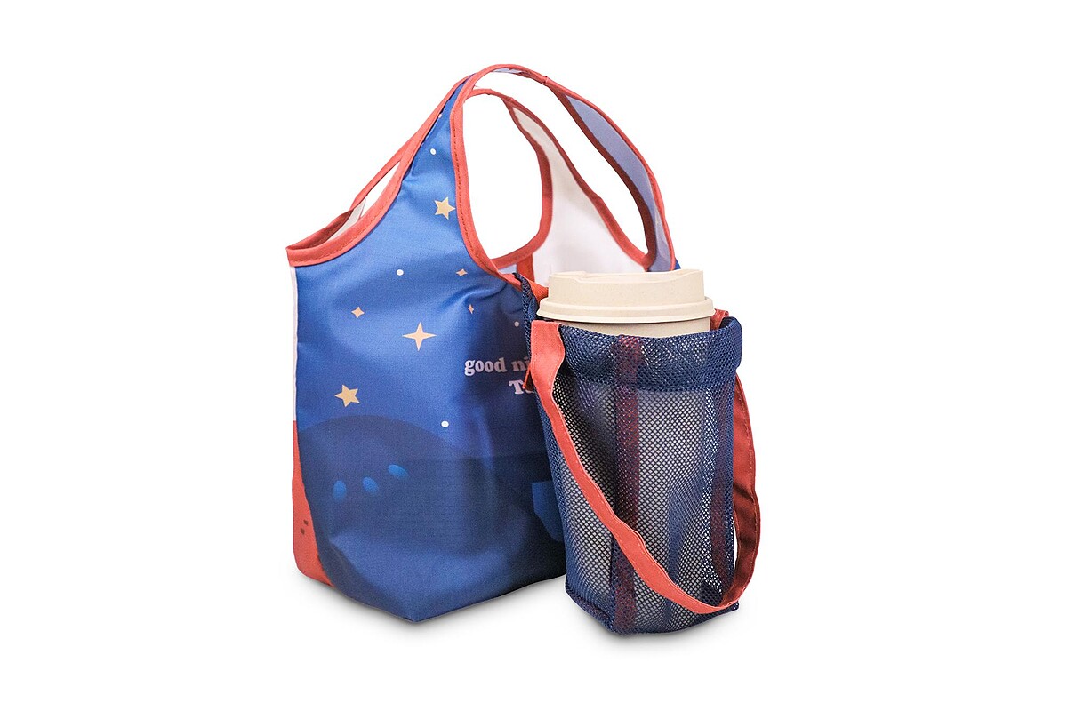 超方便的環保購物袋和飲料袋,來台灣的旅客不能錯過的體驗之一就是喝手搖飲,這款餐餐袋是與台灣包袋品牌murmur合作開發,以旅行為主題的台北101限定款餐餐袋,購物袋、飲料袋都可拆開來單獨用,或是購物袋和飲料袋並用,輕巧好收納,價錢也很合理。