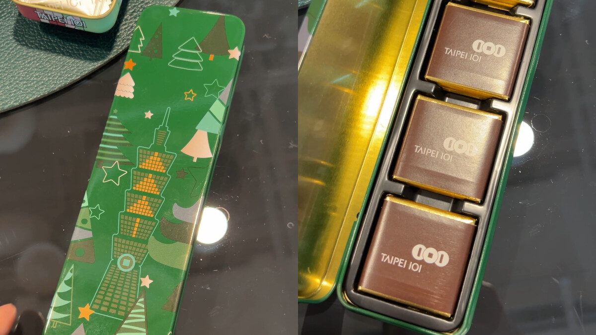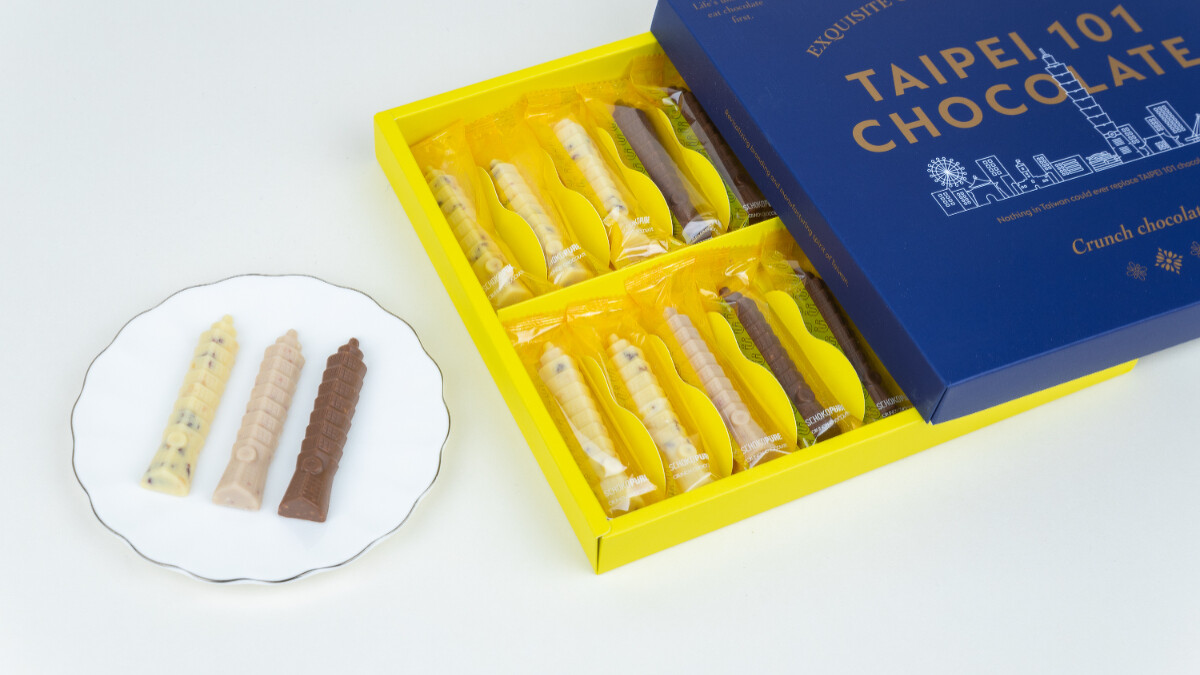 長長的鐵盒做成台北101高聳矗立的樣子,裡面裝載著非常具有識別度的101巧克力,可以一次購入各種顏色的鐵盒巧克力款式分送親朋好友,因此成為最佳伴手禮與紀念品,銷售最好的顏色是藍色。