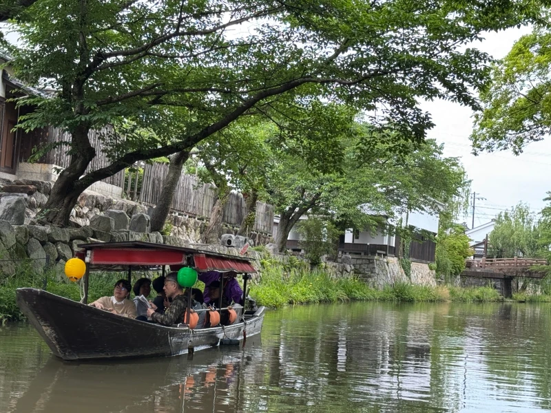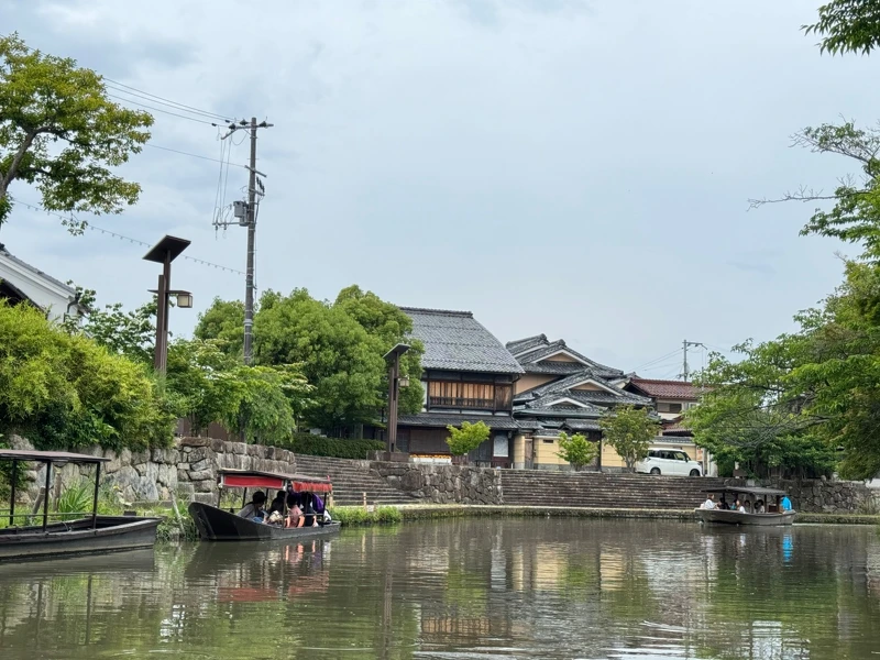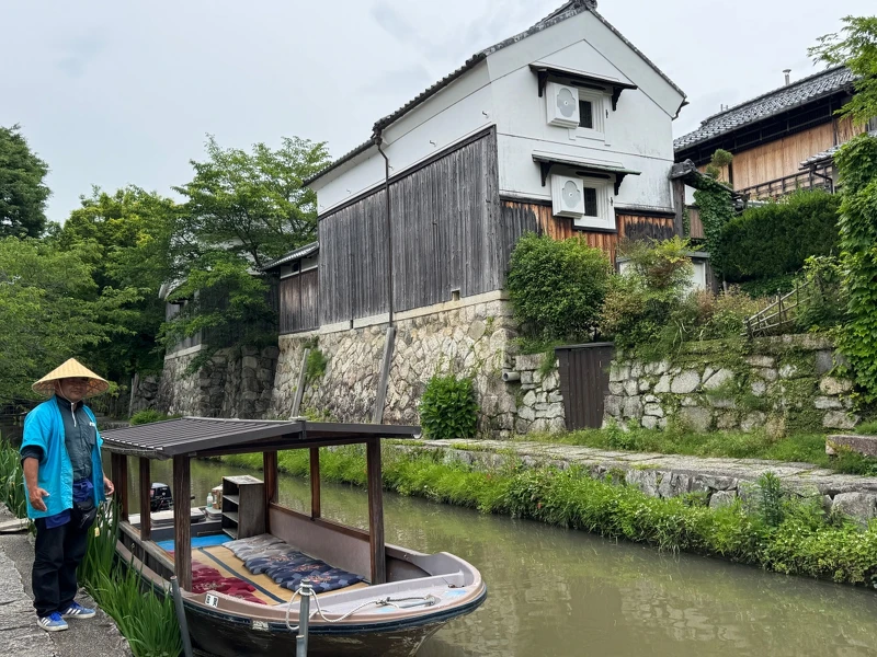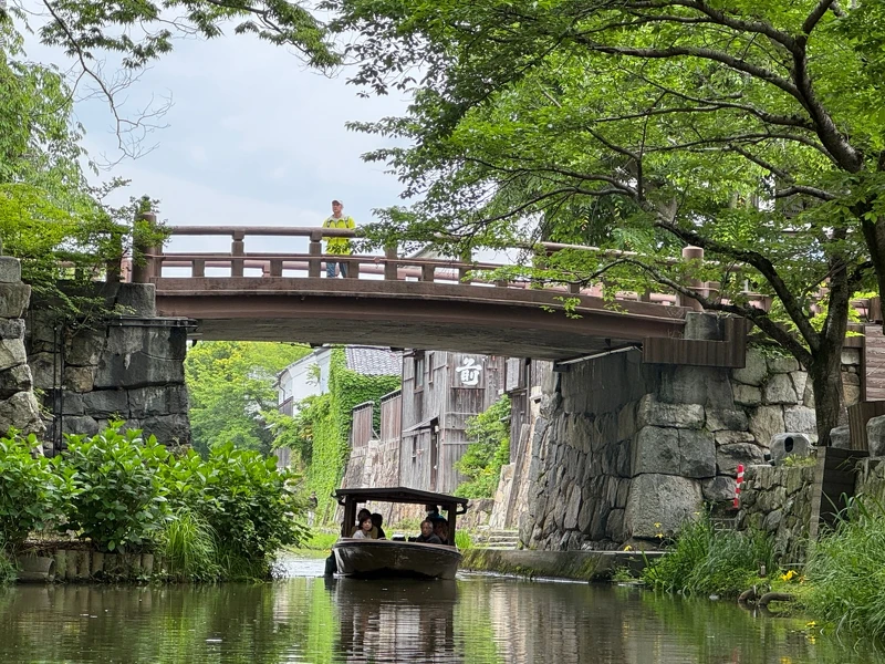 今天的八幡堀,依舊保留著江戶時代的風貌。沿著水道散步,會經過一座座低垂的柳樹與古樸的石橋,白牆土藏倒映在水面,微風拂起時,畫面如詩如畫。更推薦花個1,500日圓搭乘觀光小船,由身穿傳統服飾的船夫撐篙,帶你在靜謐的水面滑行約 35分鐘。途中,船夫會娓娓道來近江商人的故事,或遇到台灣客人時,更會細心烙一句中文「小心頭!」,提醒你上下船隻時不要撞到自己的腦門。