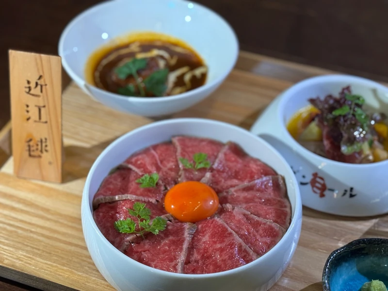 距離大津車站僅兩分鐘步程的 NIKUBARU Modan Meel,是當地人下班聚會與旅人補充能量的熱門去處。餐廳以滋賀引以為傲的近江牛為主角,從炭火直烤牛排的焦香與軟嫩、一次網羅菲力、沙朗與肋眼的拼盤,到肉汁飽滿、佐濃醬與半熟蛋的手打漢堡排,以及入口即化的炙燒牛壽司,每一道都展現了和牛的不同風貌。伴隨熱鬧溫暖的氛圍,來上一杯精釀啤酒或紅酒,更能讓這份飽足感延伸成旅程中的難忘片段。