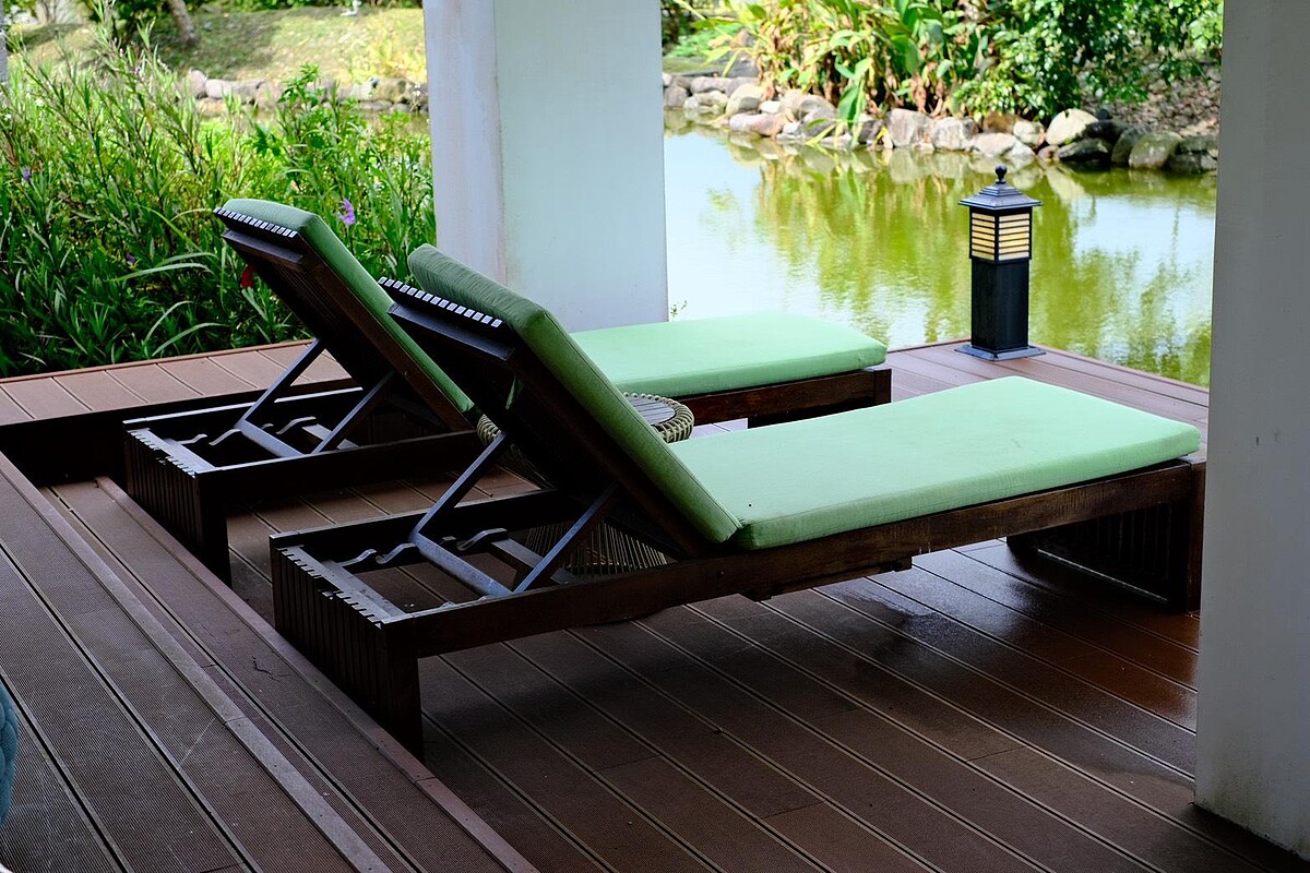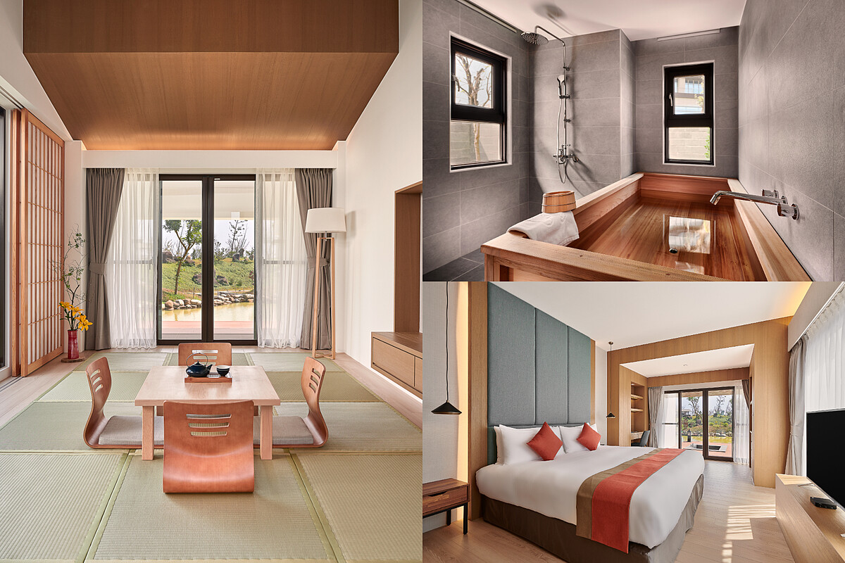 這次小編要來開箱的主角「豪華庭園Villa」是園區中最受矚目的住宿選擇之一,整棟獨立設計,擁有上下兩層、共55坪的寬敞空間,1樓30坪、2樓25坪。日式和風建築的線條溫潤細緻,室內格局兼顧機能與美感。踏進室內迎面而來的是寬闊的客廳與精緻的木質家具,主臥室空間氣派,浴室內設有檜木浴缸,散發淡淡木香,泡澡時更能欣賞庭院景致。Villa附有專屬獨立庭院,讓住客擁有完全的隱私與靜謐時光。