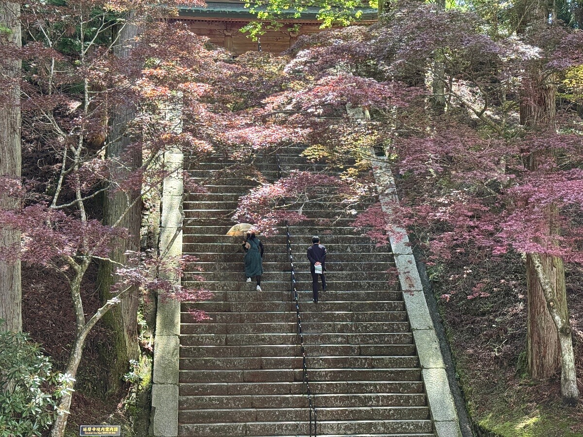 沿著蜿蜒山道攀升,比叡山的氣溫比市區低了好幾度,山林的清涼氣息包裹著每一步。延曆寺作為天台宗總本山,被列入世界文化遺產,其歷史可追溯至1200多年前。這裡曾是日本佛教多個宗派的修行源頭,無數高僧在此入定、誦經、開悟。