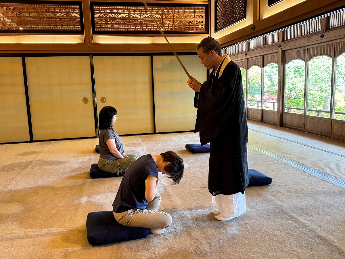 坐禪體驗在一間安靜的堂內進行,木地板經歲月磨得溫潤,盤腿坐下時,能聽見窗外鳥鳴與遠方傳來的鐘聲。僧人以低沉的聲音引導呼吸,提醒我們將注意力回到當下,讓心緒如湖面般澄明,接著再以竹杖(即是「戒尺」)輕敲我們肩部,像在點醒我們早日從瞋癡愛恨的迷霧裡覺醒。坐禪費用1100日圓,得事前預約。