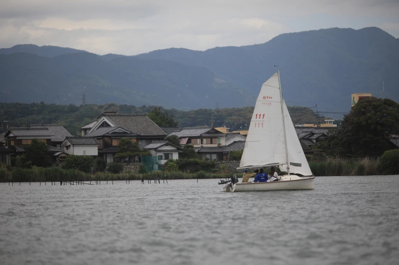 當帆被拉起,船隻在風力推動下開始滑行,水聲拍擊船身的節奏比引擎聲更令人著迷。教練讓我們輪流嘗試掌舵與調整帆向,雙手感受到風壓傳來的力量,一邊在教練指揮下打著複雜的結繩,頗能感受水手的氣勢與威嚴。視線向遠方望去,四周是被群山環抱的湖面,這種視角比在岸上更開闊,也更能感受到自己與自然同感的片刻。船長說,春天適合賞櫻,夏天擇有燦爛花火大會可看,一年四季都不寂寞。Rivaré 的社長耐央子一邊帥氣掌舵,一邊聊到反町隆史與松嶋菜菜子夫婦經常到琵琶湖度假,興致一來也常開著自家帆船到湖上暢遊。知道自己此刻體驗的是明星級的待遇,眼前湖景瞬間更加不凡了。