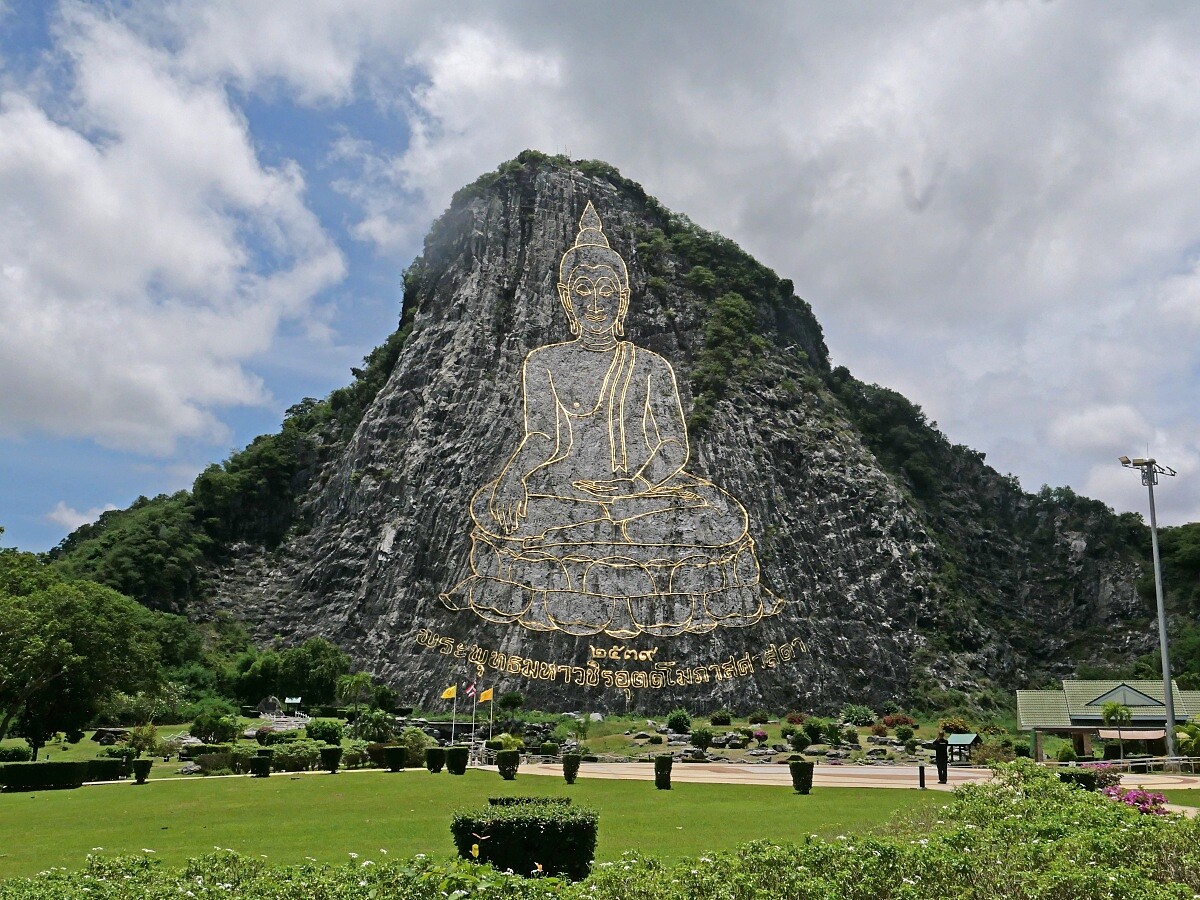 位於芭達雅近郊的七珍佛山(Wat Khao Chee-chan / Khao Chi Chan),是當地最熱門的地標。整面石灰岩山壁上雕刻著一尊巨型佛像,高達一百多公尺、寬約七十公尺,以雷射雕刻後再覆上金箔,在陽光下閃耀如金,遠遠就能看見,場面壯觀。佛像在1996年刻畫,用來紀念拉瑪九世登基 50週年。山腳下還規劃了庭園與蓮花池,氛圍靜謐而莊嚴,既適合遊客拍照留念。