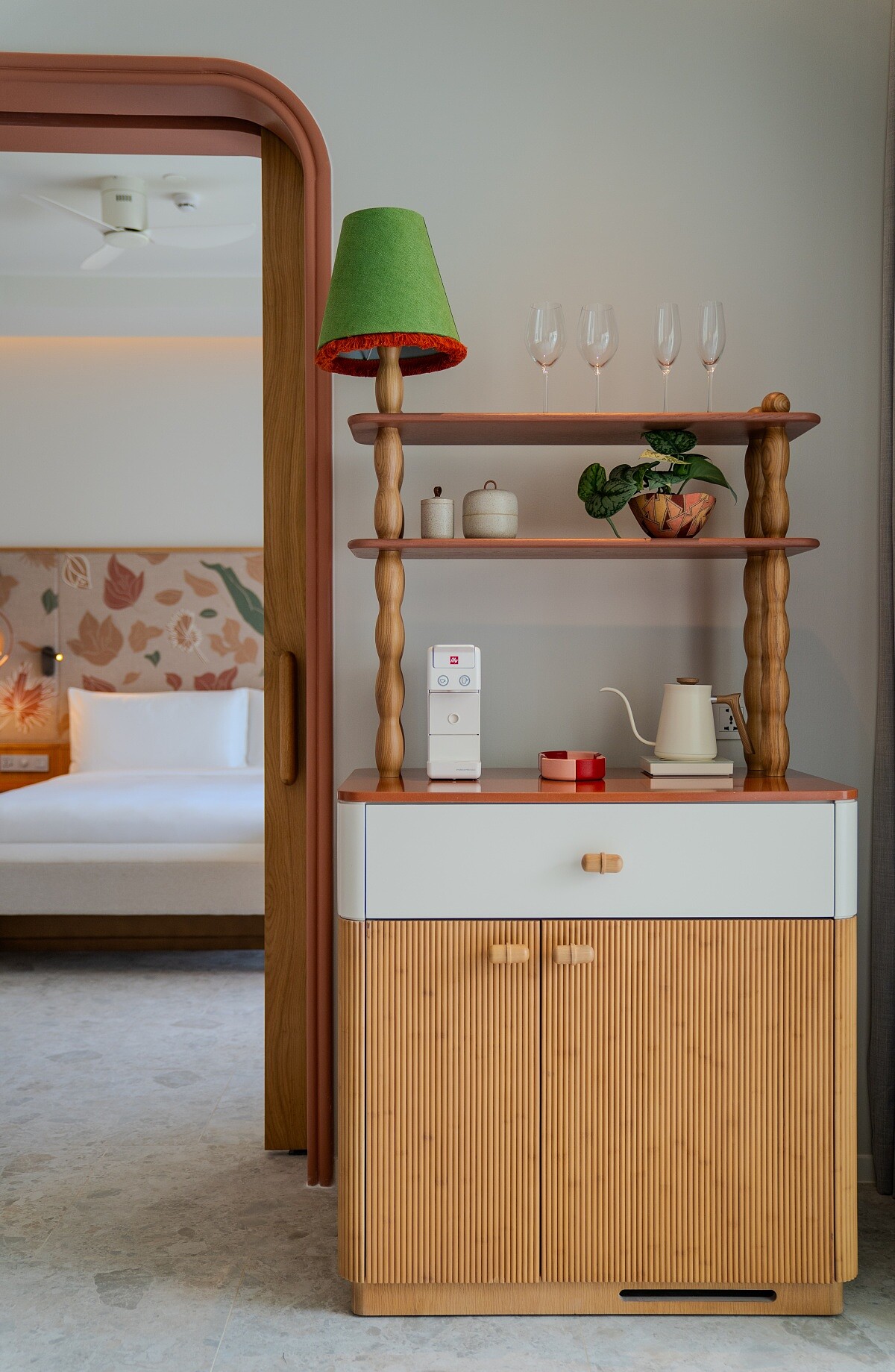 房間裡延續了「The Standard」一貫的俏皮感,床頭板畫滿葉片和海洋的手繪圖案,中間嵌著一盞紅色「唇形燈」,另一頭設計師則以線條、色彩妝點牆壁,把衝浪、跳水還是游泳的畫面定格在空間內,既搶眼又帶點幽默。家具多以圓潤的線條為主,那張條紋布料的座椅是房裡最舒服的角落,一旁的綠色圓桌搭配木質桌腳,簡單卻有趣,也呼應了飯店大膽又溫潤的設計。整體氛圍明亮而帶點玩心,真的讓人輕易就放鬆下來,真正全新投入度假的節奏。