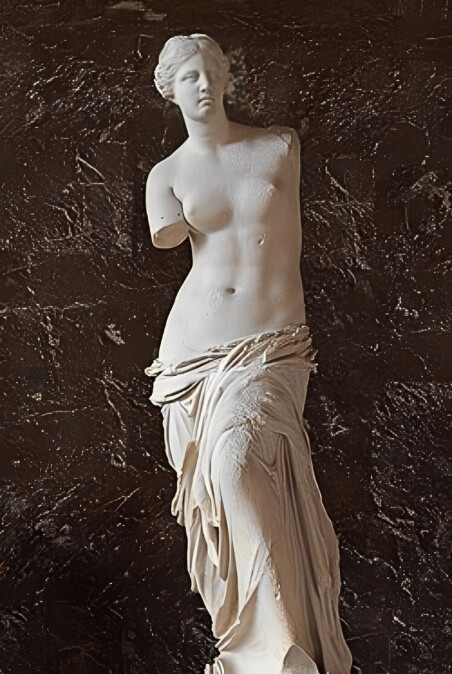 這尊維納斯雕像,是古典女性美的代表,也是古希臘雕塑的極品。 這尊雕像在1802年於塞斯蘭德斯的米羅島上被一位農夫發現,有人說雕像出土時雙臂已斷,也有一說是雕像在英法爭奪中導致雙臂折斷,迄今真相無從考究。