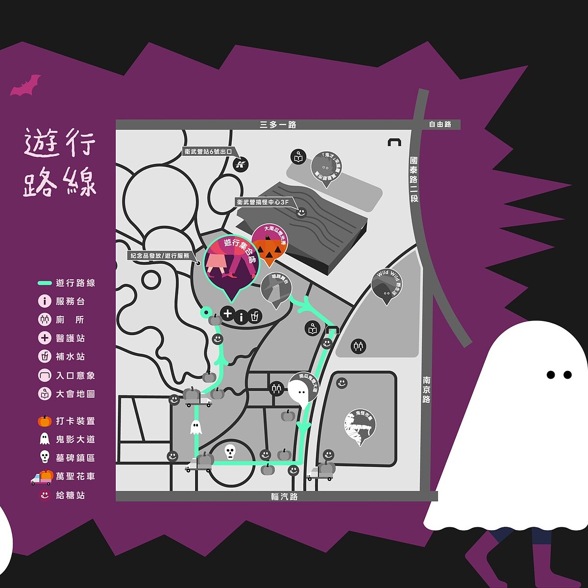從大南瓜前集合→萬聖花車領軍出發→沿途打卡裝置、南瓜鬼燈大道