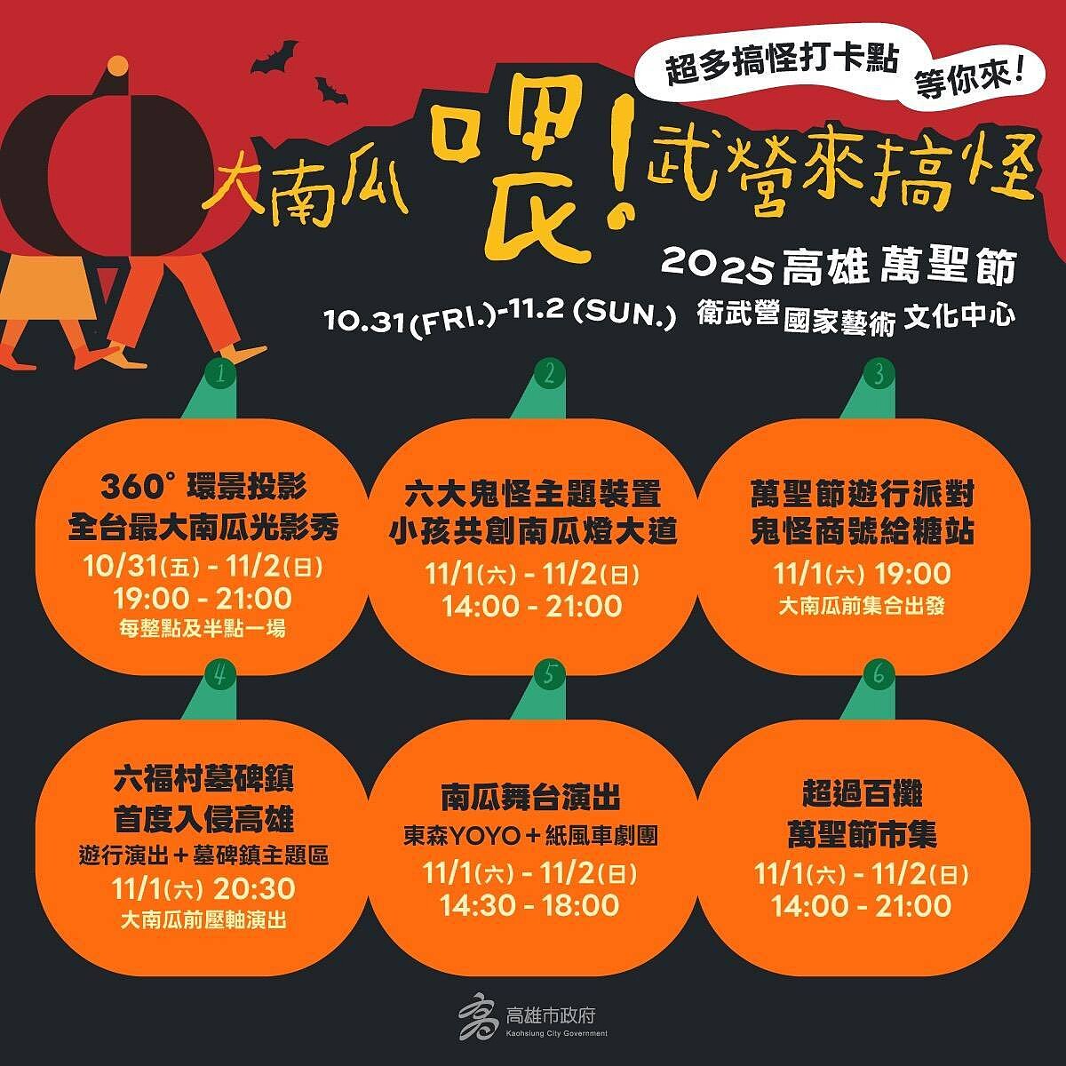 迎接萬聖節到來,高雄準備驚喜連連的奇幻盛宴—「2025高雄萬聖節|喂!武營來搞怪」,將於10/31(五)~11/2(日)連續三天在衛武營國家藝術文化中心熱鬧登場!這場眾所期待的萬聖節派對,看點有22公尺巨型南瓜燈光秀、百攤萬聖市集、創意變裝遊行等6大精彩活動,要把衛武營打造成南台灣最有熱鬧氣氛的搞怪天堂。