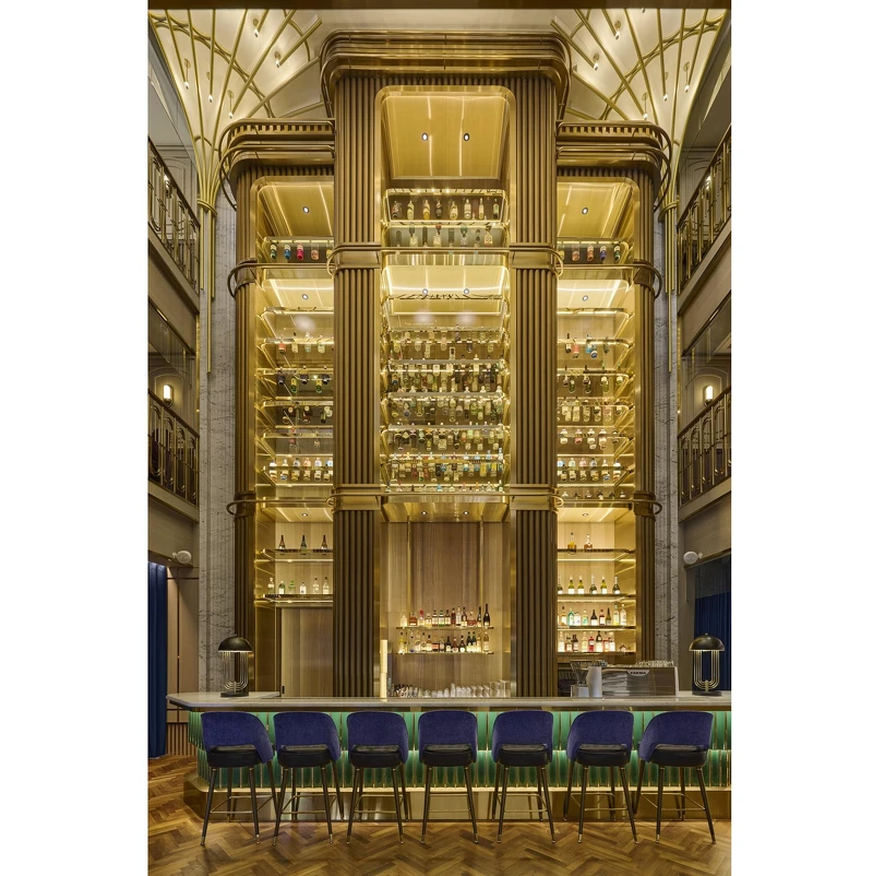 Ailìse 內部高聳的酒瓶牆結合流動光影與鏡面反射,營造夢境般的氛圍——既是味覺旅程的起點,也是旅人與城市靈魂交會的延伸。