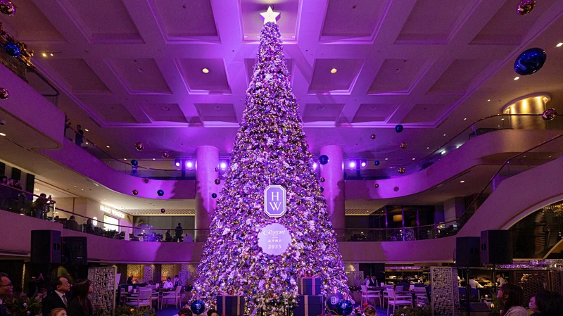 饕客們最愛的台北晶華酒店,每年聖誕樹總令人引頸期盼!今年同樣在一樓中庭打造近12公尺的「全台飯店最高聖誕樹」!樹身綴滿2000顆、象徵海瑞溫斯頓Harry Winston品牌色的藍球與金球,搭配綠白色交織的榭寄生葉,並呼應永續經營理念使用LED燈串,40天展期可節省5800度電,相當於減少2865公斤碳排放量。即日起至12/25 12:15~21:15(每小時15分)都會有2.5分鐘音樂燈光秀,還能與聖誕老公公合照,洋溢著幸福溫馨氣氛。
