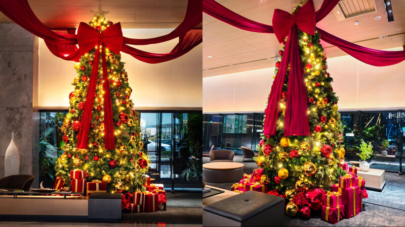 高雄日航酒店把聖誕樹跟禮物結合啦!今年以「日航星誕」為主題,將整間酒店打造成一份精心包裝的冬日禮物,大廳中央有棵5米高聖誕樹,上頭以金色、紅色飾品,以及象徵禮物緞帶的蝴蝶結點綴,營造出優雅而溫暖的節慶氛圍。旅客踏進酒店時,宛如拆開聖誕禮物、沉浸在專屬的夢幻季節裡。