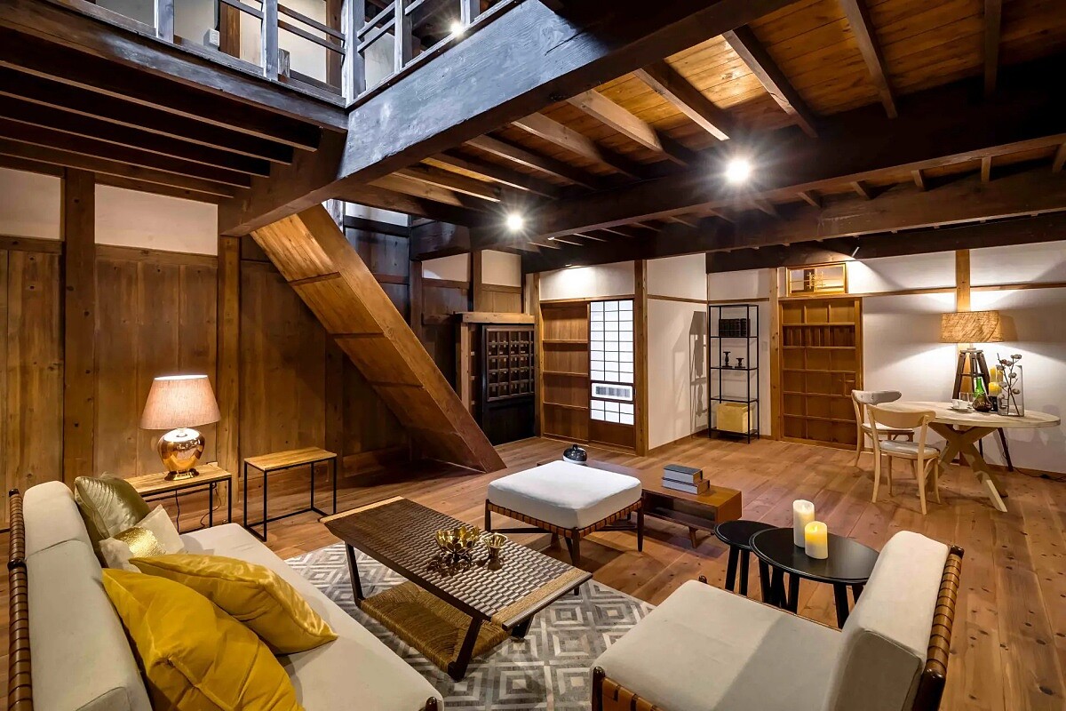 因此每一棟都是獨立的建築單位,可能前身是棉花工廠、土藏倉庫、或保留瓦片與木梁的老商家。甚至有幾戶的一樓空間仍持續營業,例如和紙店、香鋪,讓你彷彿就寄宿在當年的生活場景裡。所有建築外觀保留兩百年前的木造肌理,但室內完全現代化,像是照明、衛浴、空調都佈置得非常舒適細膩。