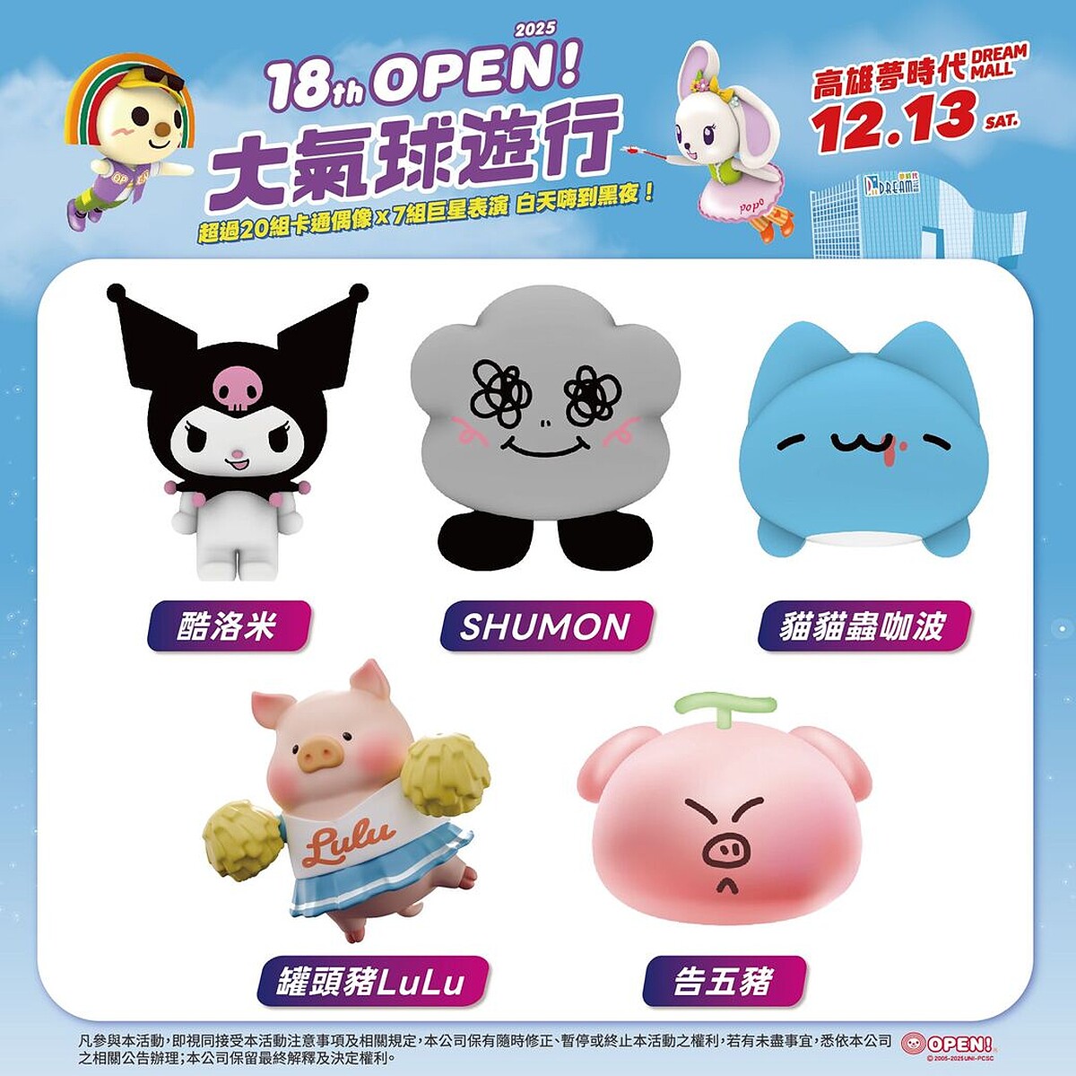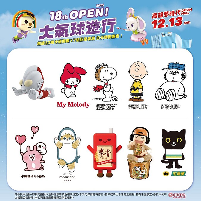 進入第18年的「OPEN!大氣球」已成年末歡樂祭典,最受大家關注的,莫過於造型氣球陣容!今年除了有大家熟悉的OPEN!家族、美樂蒂、貓福珊迪、SNOOPY、歐拉夫,更加入酷洛米、貓貓蟲咖波、SHUMON、罐頭豬Lulu、告五豬等全新5位人氣明星,攜手,會共有多達20顆巨萌氣球參加遊行,打造難得的可愛城市風景。