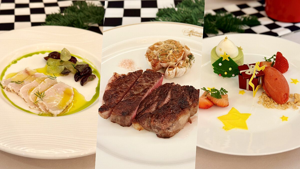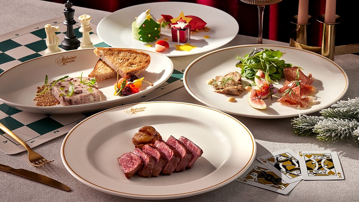 聖誕大餐決定了嗎?二樓走浪漫巴洛克風格的安東廳牛排館,在12/24~25兩天推出「放玩聖誕饗宴」,前菜選擇有炙燒海鱺魚、香煎日本北海道干貝、至尊奧實嘉魚子醬;湯品有聖誕限定「和牛蔬菜湯」、招牌「經典干邑風味龍蝦濃湯」、「蘑菇卡布奇諾湯」可選擇。主菜主菜則包括油淋風味「Flannery乾式熟成28天丁骨牛排」、鹽燒風味「美國Prime菲力牛排」與「美國蛇河農場極黑金牌和牛肋眼牛排」、「紐西蘭Lumina高地和羊」等精選料理為佳節留下美味回憶。甜點有「法國白桃香草冰淇淋」、「火焰焦糖薄餅」及聖誕限定「開心果蛋糕」作為甜蜜收尾,每套3680元+10%起。