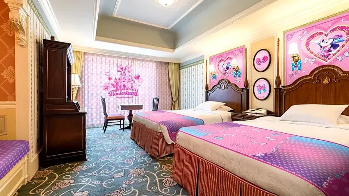 東京迪士尼樂園大飯店活動期間同步推出限定「米妮主題套房」,從床單、窗簾、壁貼印有米妮、愛貓費加洛、菲菲的可愛身影,入住還可獲得限量版心形明信片與專屬房卡。