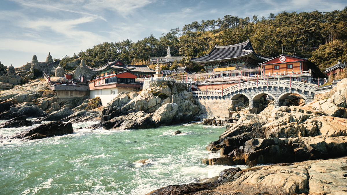海東龍宮寺是一間供奉著觀世音菩薩、傍海而立的廟宇。在韓國有一個傳說:觀世音菩薩居住在海岸孤絕處並乘龍顯靈,所以韓國的觀音信仰大多在海邊或島嶼。前往寺廟的途中,會遇到一個小岔路,那裡是拍攝寺廟與大海相依景象的絕嘉定點。