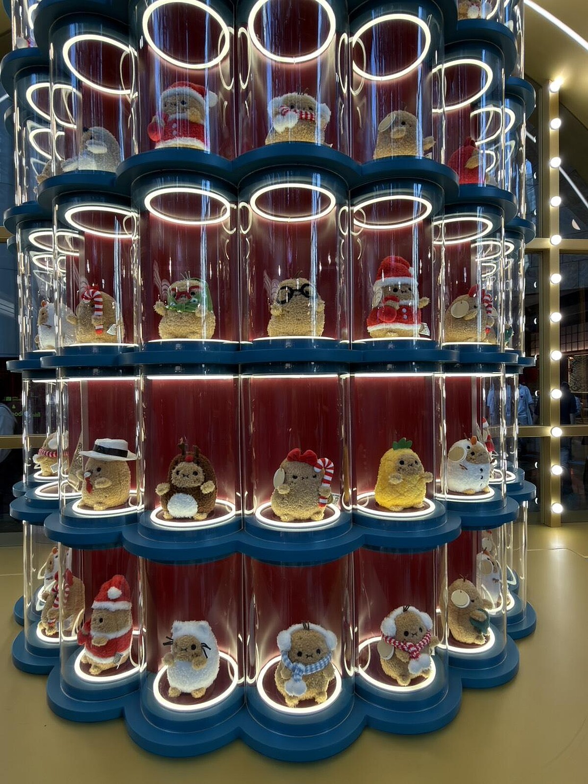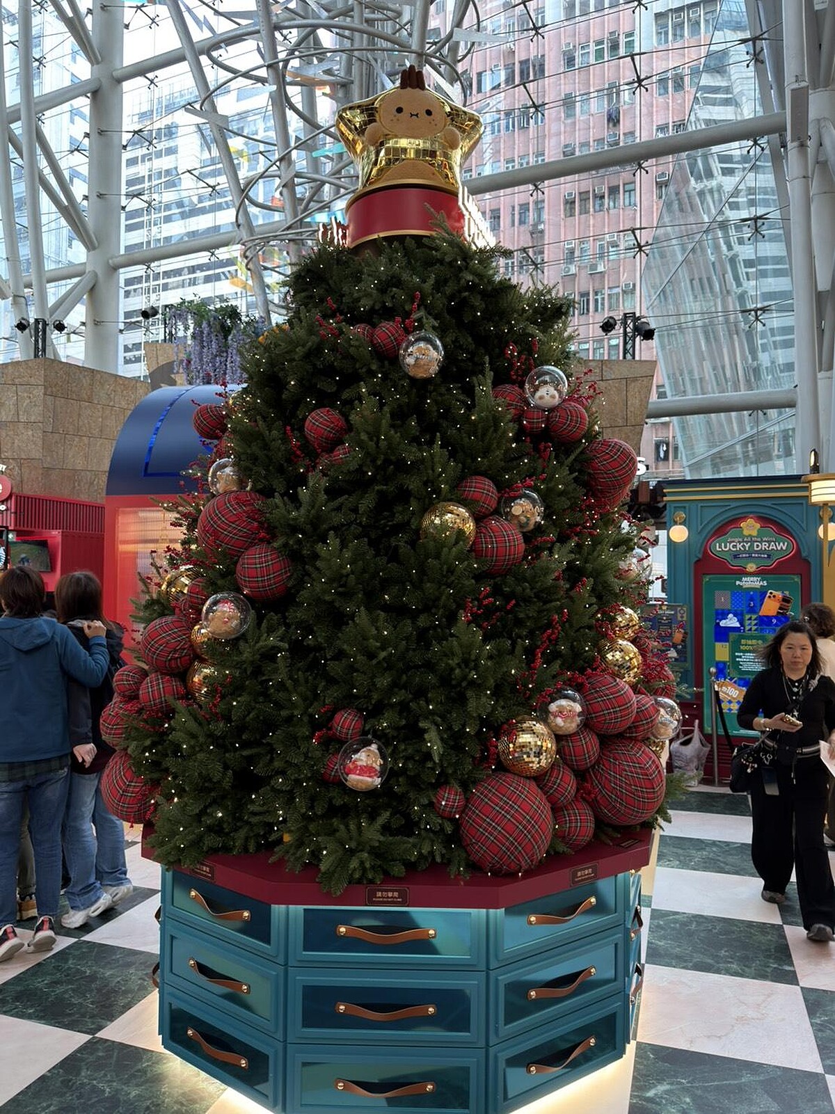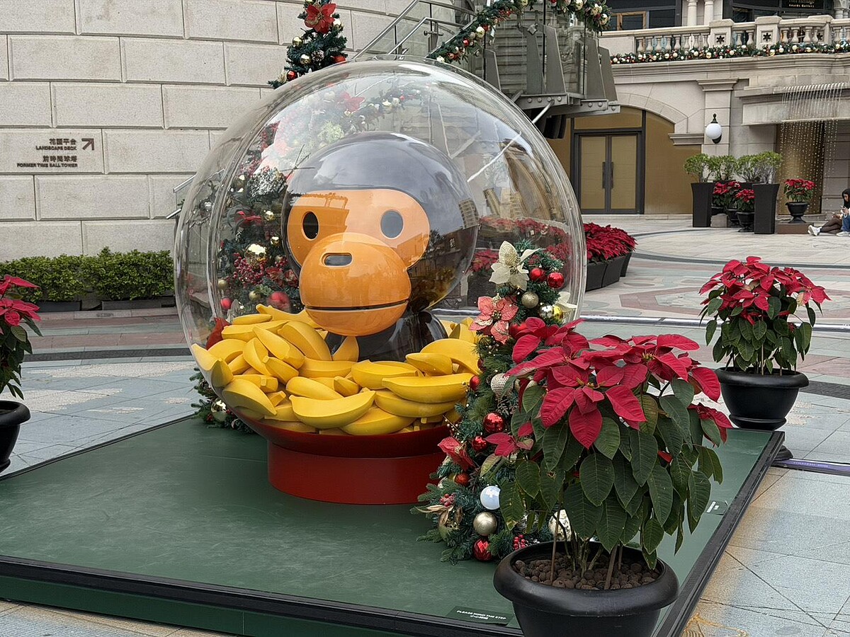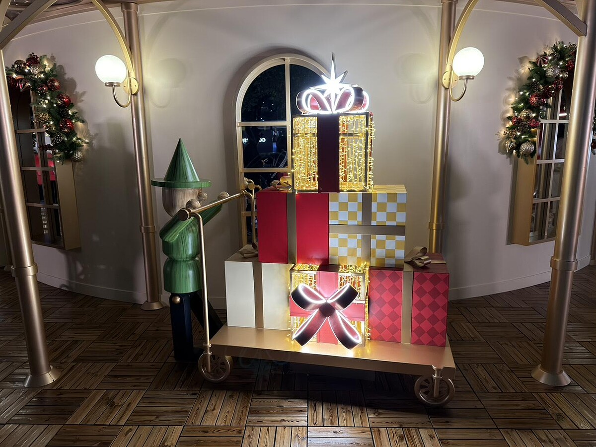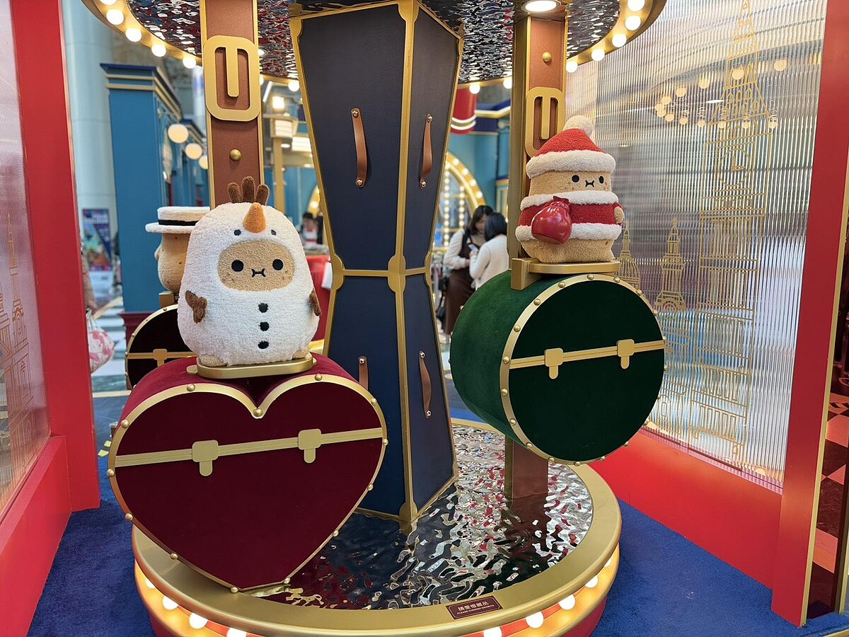 如果說中環是舞台、尖沙咀是嘉年華,那麼旺角朗豪坊則用「玩」替年末畫下句點。朗豪坊迎來20周年,以「WoW!WePLAY」為主軸,年末邀請英國品牌Noodoll的薯仔家族首度登陸香港,打造「Merry PotatoMAS」。商場4樓通天廣場化身為百貨公司場景,紅金色調與燈飾交織,節慶感中帶著幽默。圓潤外型、呆萌表情的Noodoll公仔散落在各個打卡點,讓人在旺角這個節奏快速的區域也能被柔軟包圍,這裡也是小編私心非常喜歡的一個聖誕節景點。
