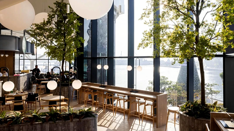 位於二樓的FULA COFFEE芙拉咖啡以階梯式座位設計,讓每一層視線都能迎向高雄港灣,白天看海、傍晚賞夕陽、夜晚感受港區燈火轉換,成為熱門拍照與放空據點。
