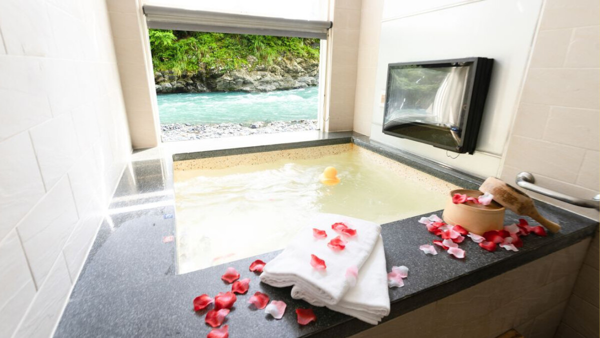 享溫泉的建築與其他傳統溫泉旅館不同,採用現代日式的水泥灰極簡設計,俐落線條充滿現代感,一踏入旅館就能感受到沉穩內斂的人文氣息。大眾池擁抱大片綠意窗景,還有半戶外的露天空間,視覺通透感極佳,打造出極具品味的靜謐氛圍,很適合想要安靜獨處、注重美感的旅客。