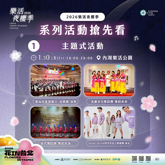 台北市春天最浪漫的夜間盛會即將展開!「2026樂活夜櫻季」將於1/30~2/22點綴內湖樂活公園,今年活動以「永續共賞」為核心主題,不僅有綿延3公里的夢幻櫻花河岸,更首次結合由回收材料打造永續裝置藝術、夜間光環境與主題表演,打造一場融合自然美景與藝術美學的春夜饗宴。