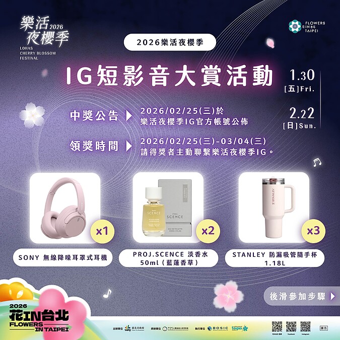 為了鼓勵民眾分享美好的賞花視角,主辦單位特別舉辦「2026樂活夜櫻季IG短影音大賞」。只需拍攝15-60秒的短影音,標註指定官方帳號並上傳至個人IG,就有機會贏得SONY無線降噪耳機、STANLEY隨手杯等精美獎品,快在此時去大展創意、影片剪輯功力。