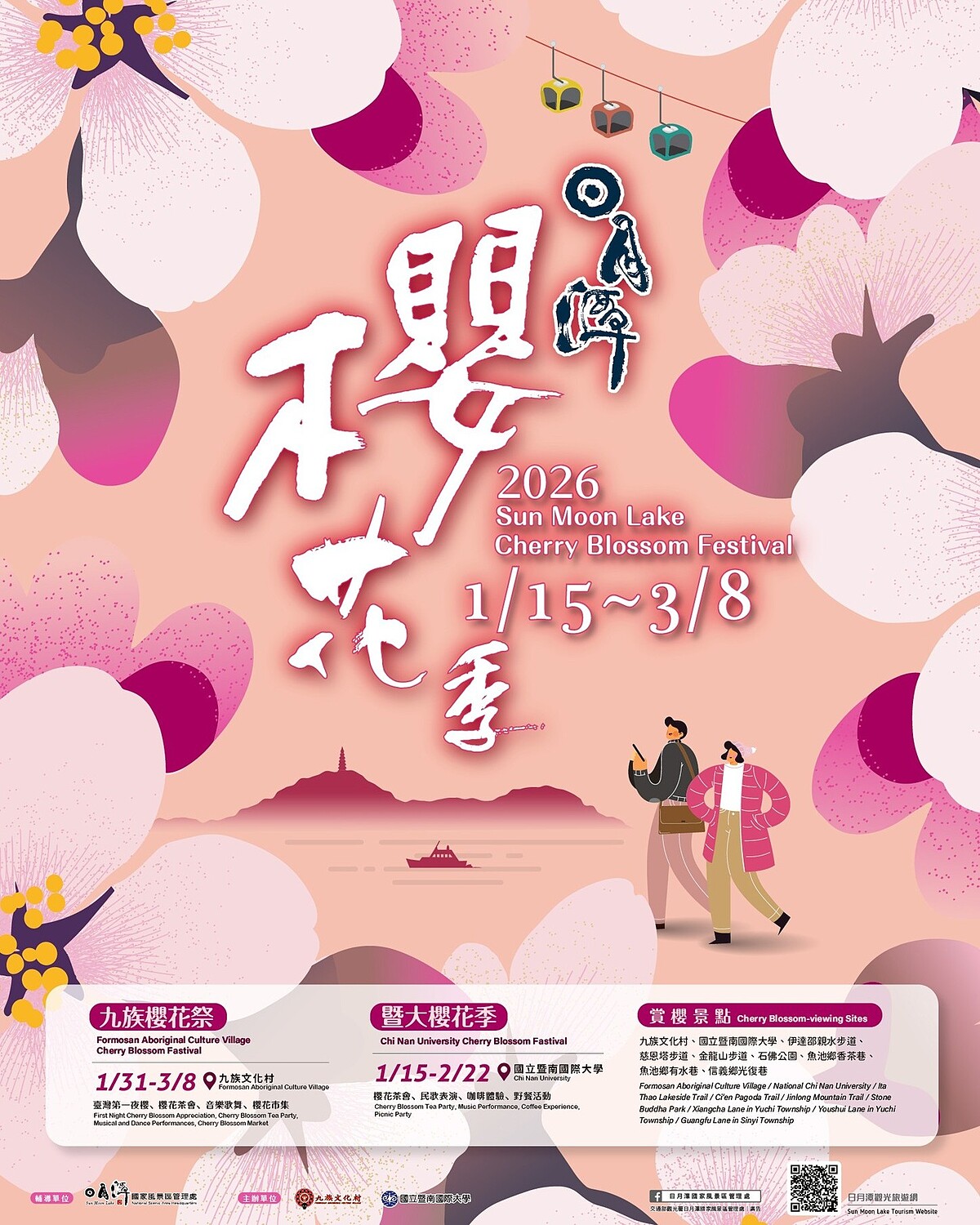各地櫻花季陸續登場,備受期待的中台灣觀光盛事「2026日月潭櫻花季」已正式起跑!10大賞櫻勝地共有超過5000株櫻花接力綻放,而兩大賞櫻勝地「九族文化村」、「國立暨南國際大學」更舉辦多項活動,帶領遊客徜徉夢幻櫻花雨中,成為走春不二之選!