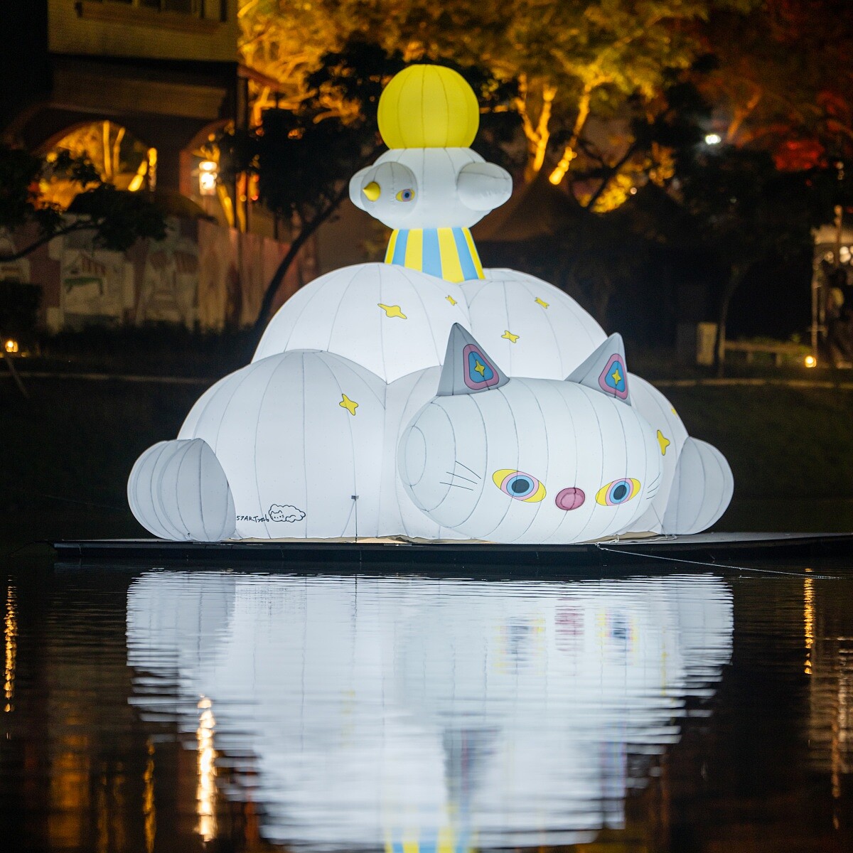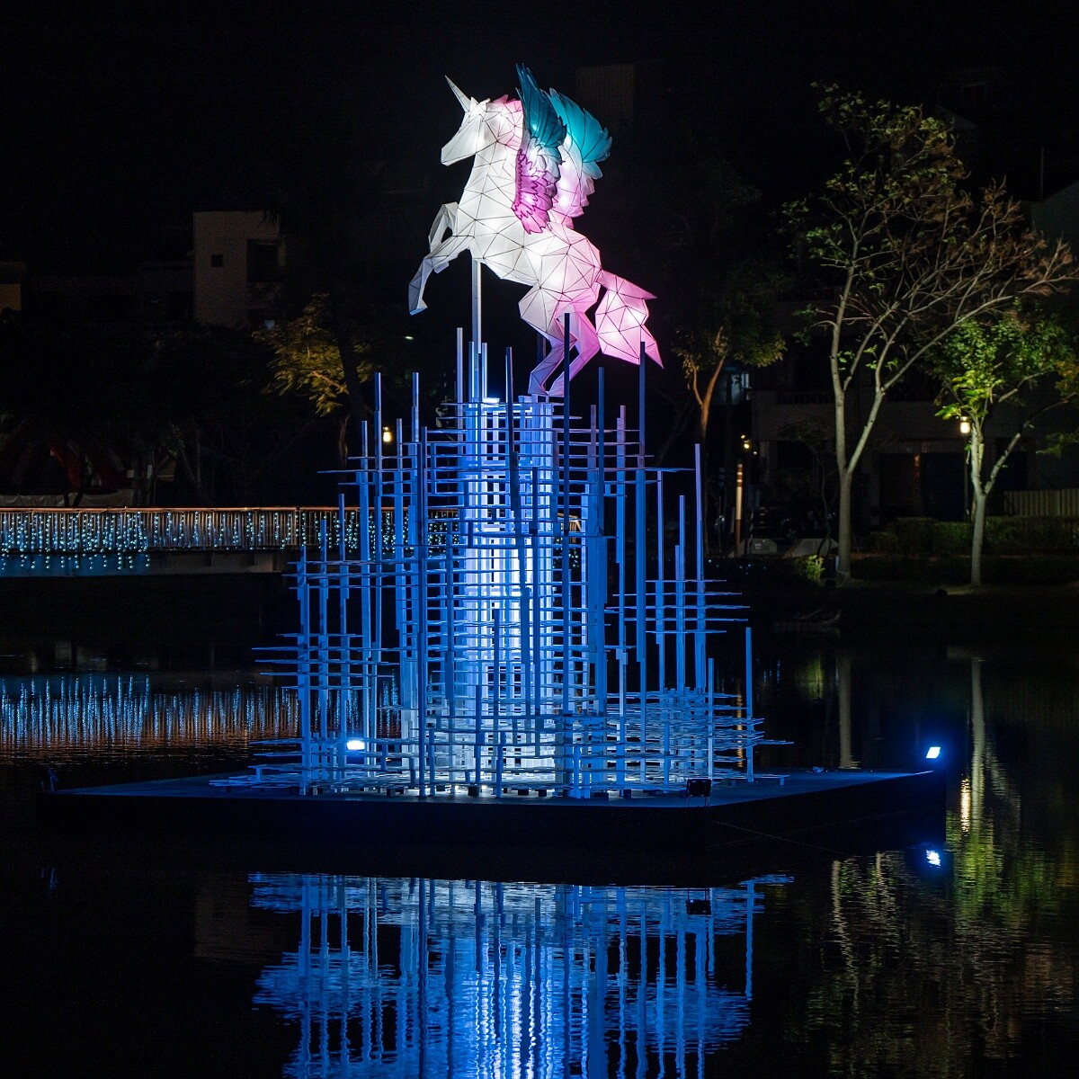 一頭來自雲端的神獸,靜靜駐留於水面之上。半透明的和紙光體散發柔亮光暈,彷彿夢想在夜色中緩緩成形。牠的獨角象徵理想與科技的交融,翅翼如雲層般開展,映照在河面,形成上下兩個時空的鏡像。